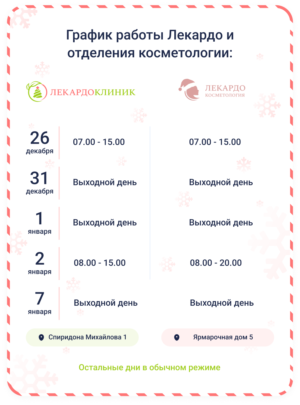 Перечень оказываемых в клинике услуг отражается в разделе «Услуги» сайта и в Прайс-листе, уточняйте возможность записи на медицинскую услугу у администрации клиники.