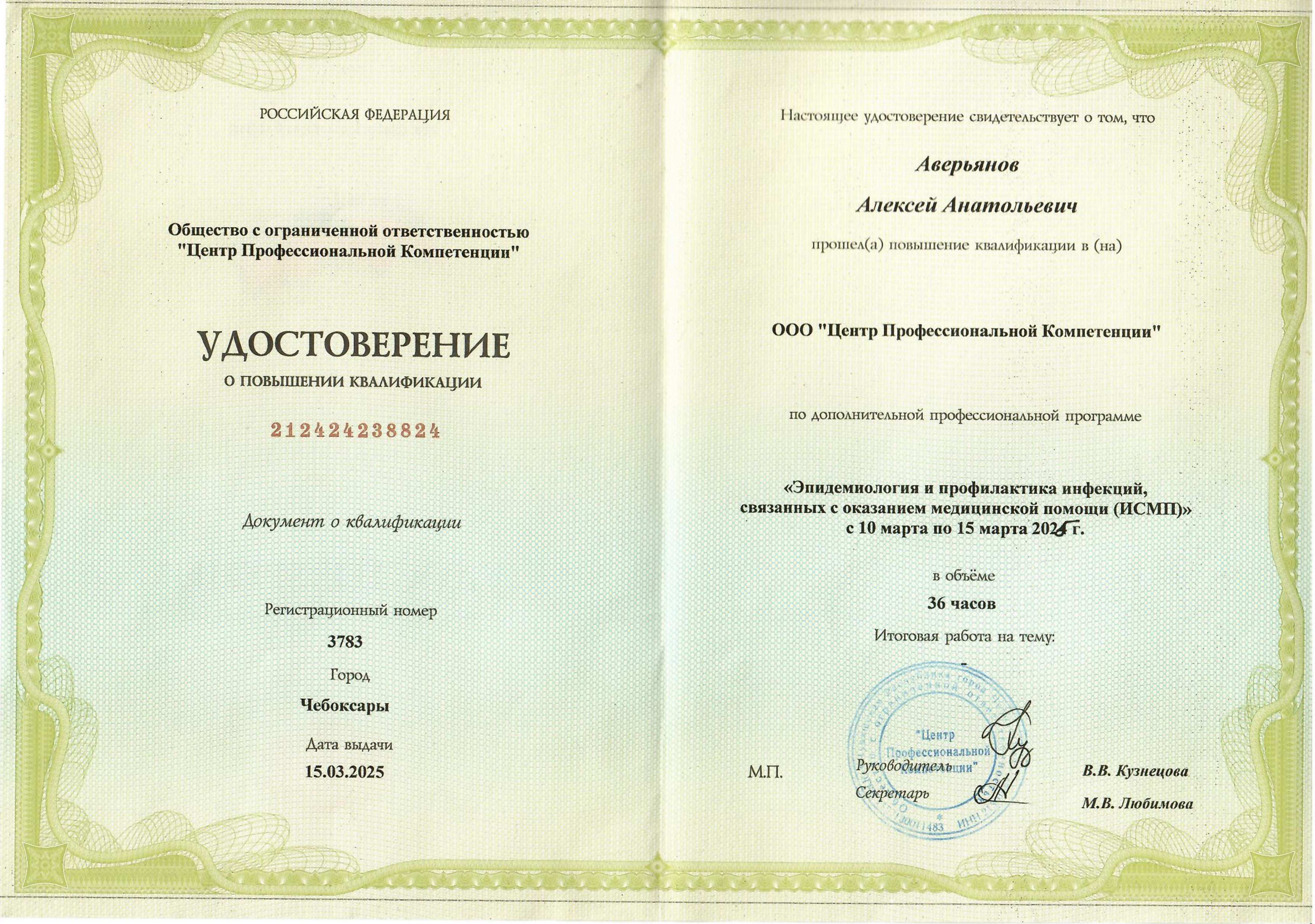 - 2025г. — ООО Центр Профессиональной Компетенции по программе Эпидемиология и профилактика инфекций, связанных с оказанием медицинской помощи (ИСМП).
