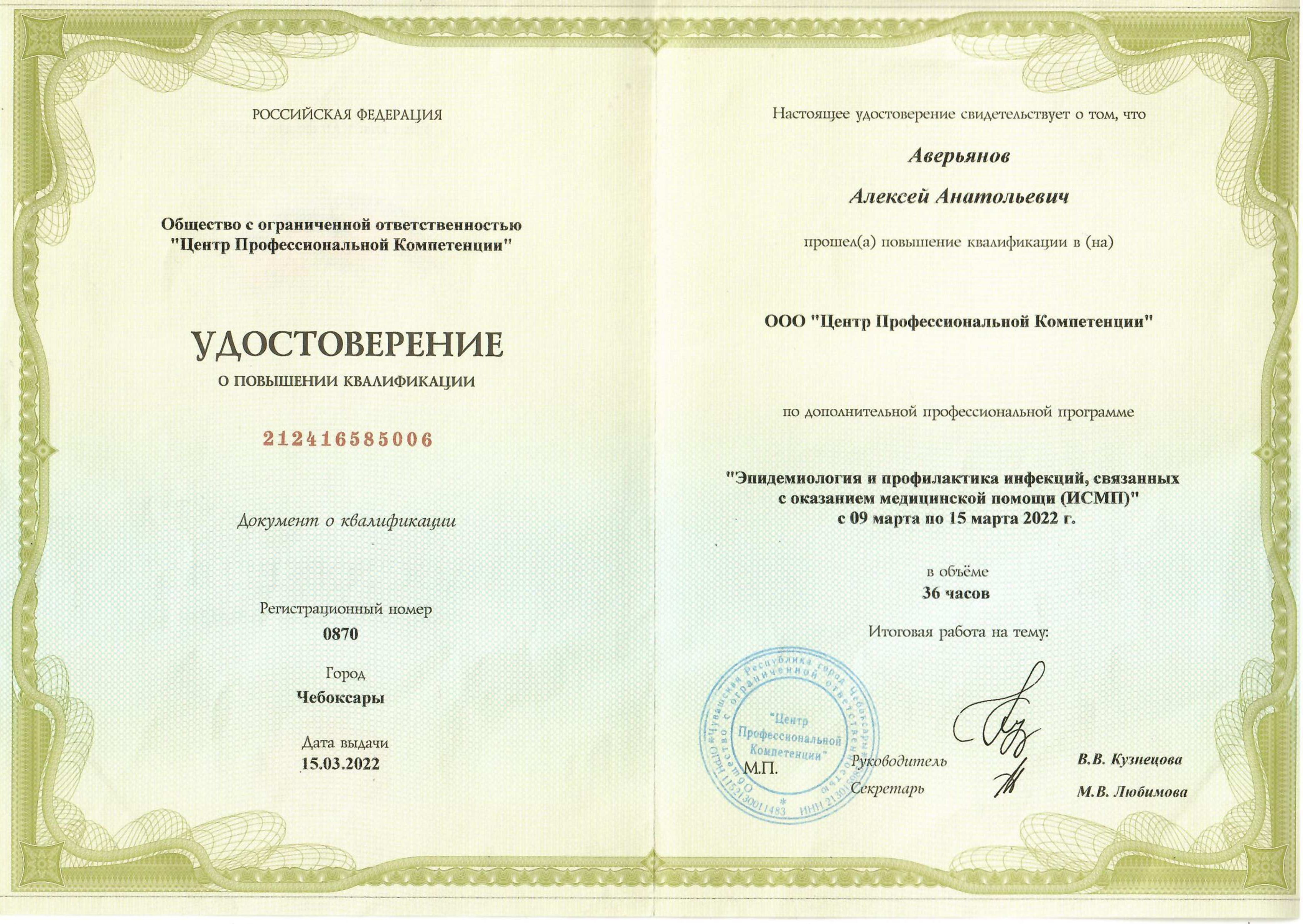 - 2022г. — ООО Центр Профессиональной Компетенции по программе «Эпидемиология и профилактика инфекций, связанных с оказанием медицинской помощи (ИСМП)»;