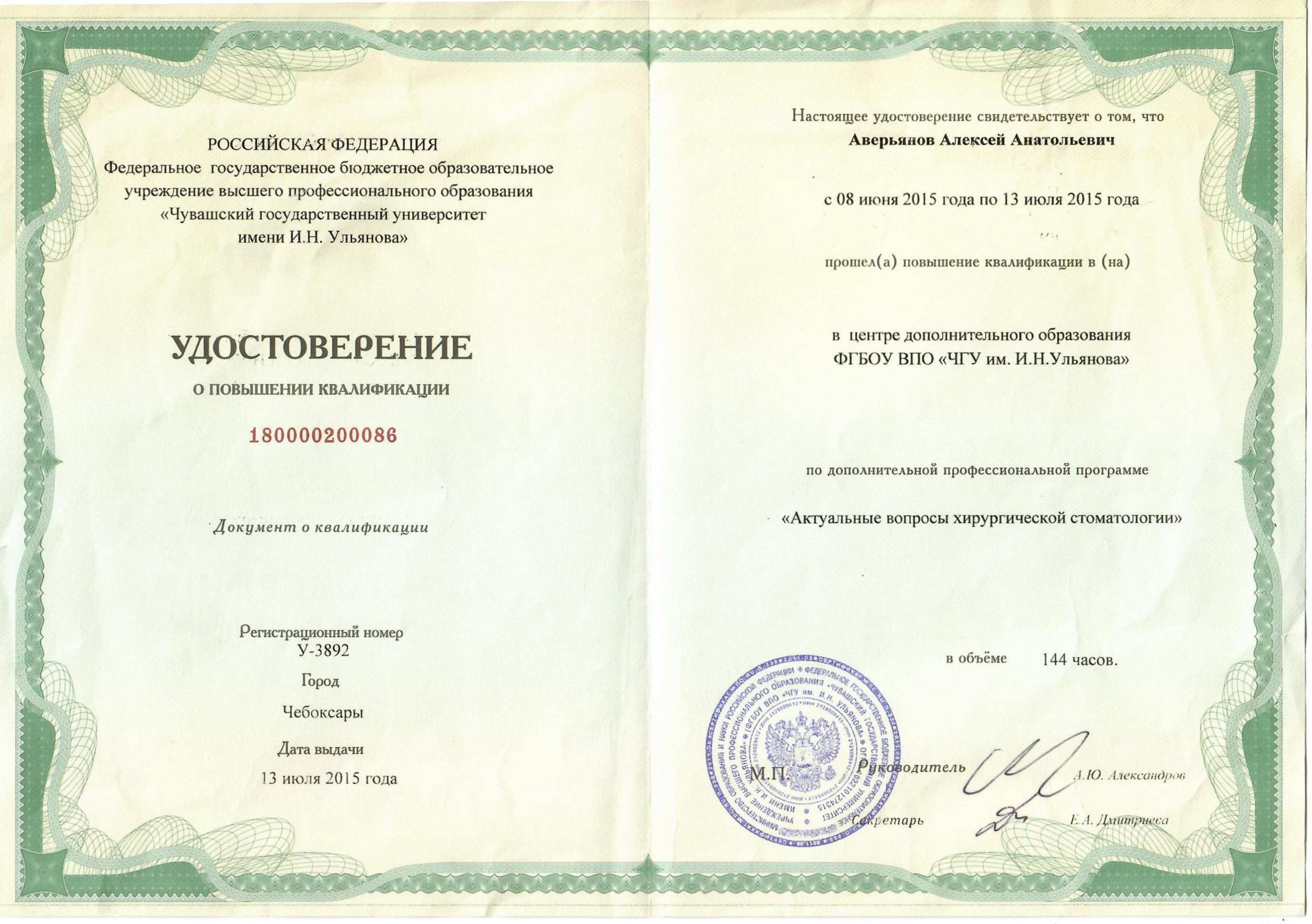 - 2015г. — ФГБОУВПО «Чувашский государственный университет имени И.Н. Ульянова» по программе «Актуальные вопросы хирургической стоматологии»;