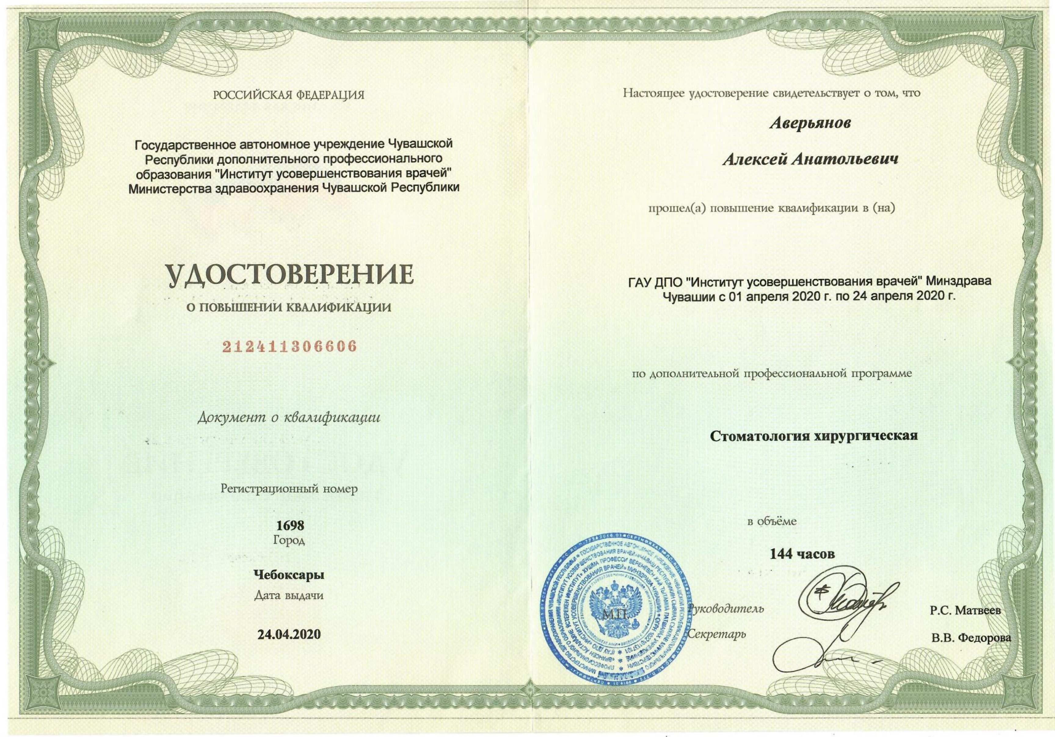 - 2020г. — ГАУ ЧР ДПО «Институт усовершенствования врачей» по программе «Стоматология хирургическая»;