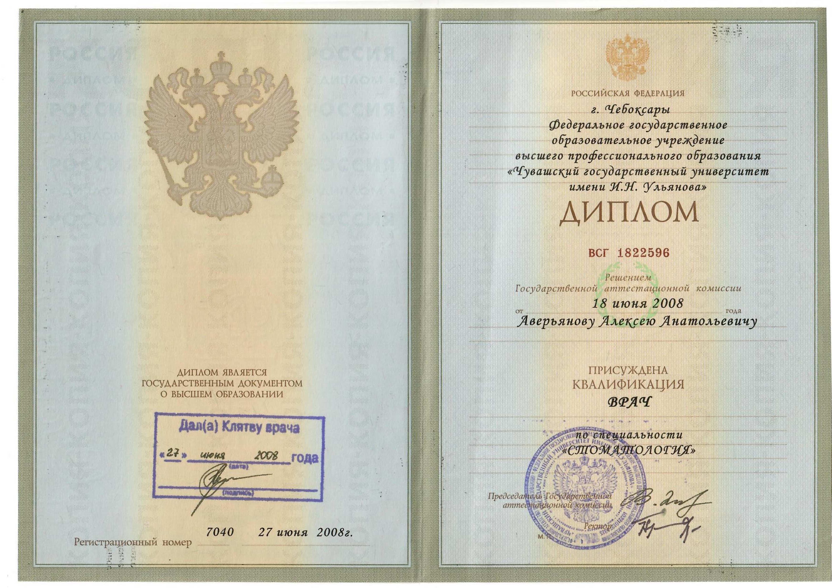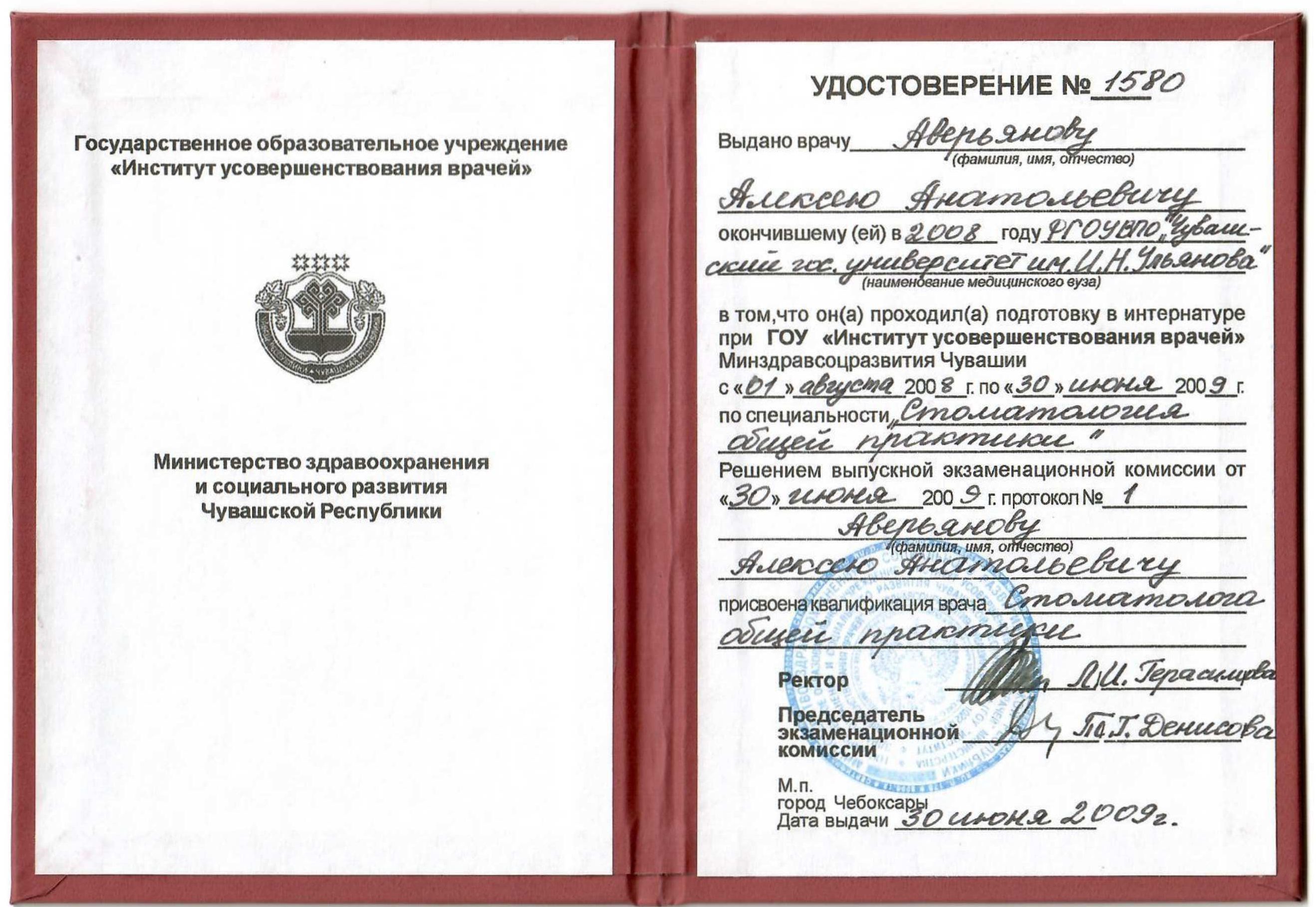 - Удостоверение о прохождении интернатуры, ГОУ «Институт усовершенствования врачей» МЗ ЧР, год выдачи 2009, квалификация «Врач-стоматолог обшей практики» по специальности «Стоматология общей практики»;