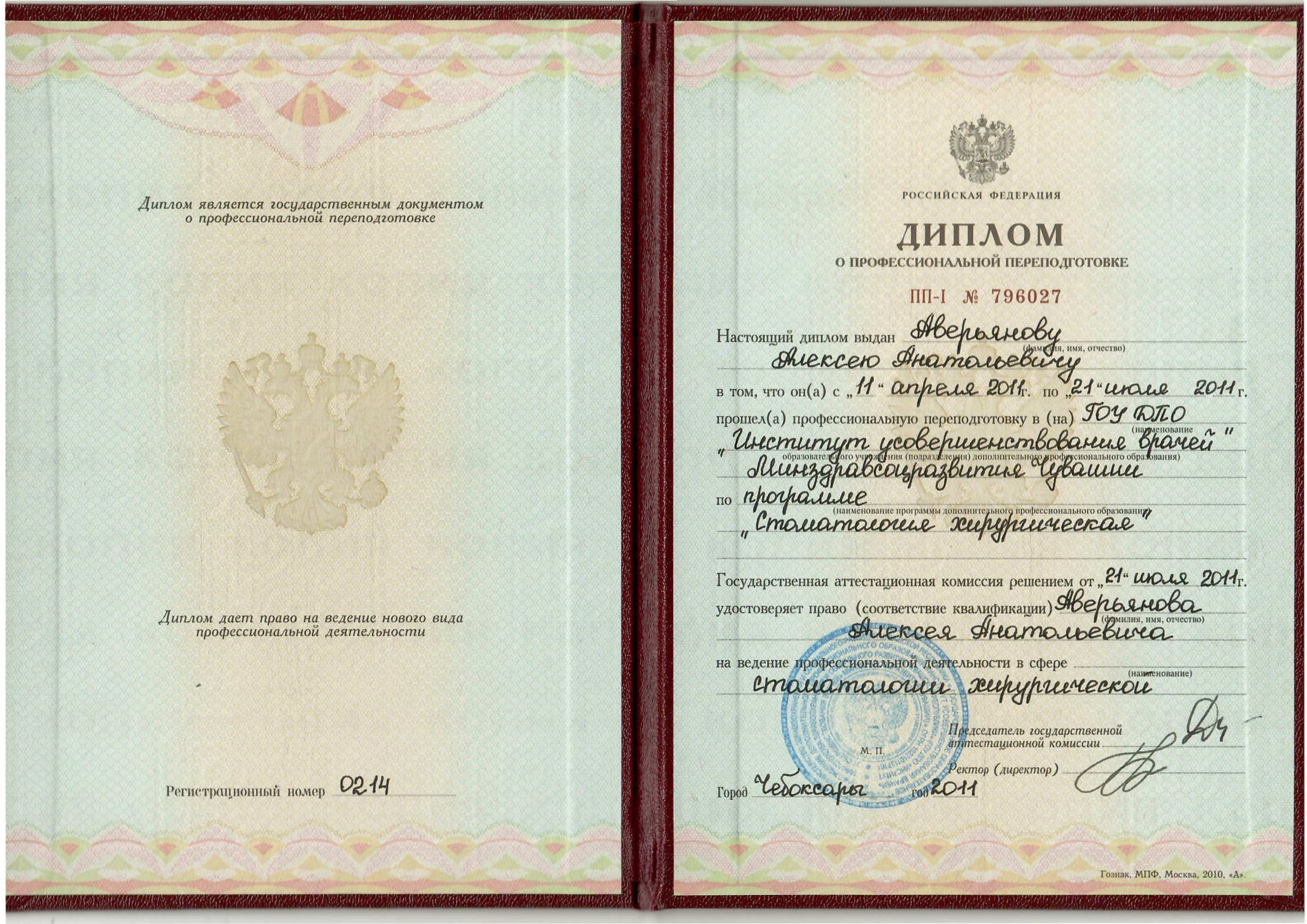 - Диплом о профессиональной переподготовке, ГОУ ДПО «Институт усовершенствования врачей», год выдачи 2011, квалификация «Врач-стоматолог-хирург» по специальности «Стоматология хирургическая».
