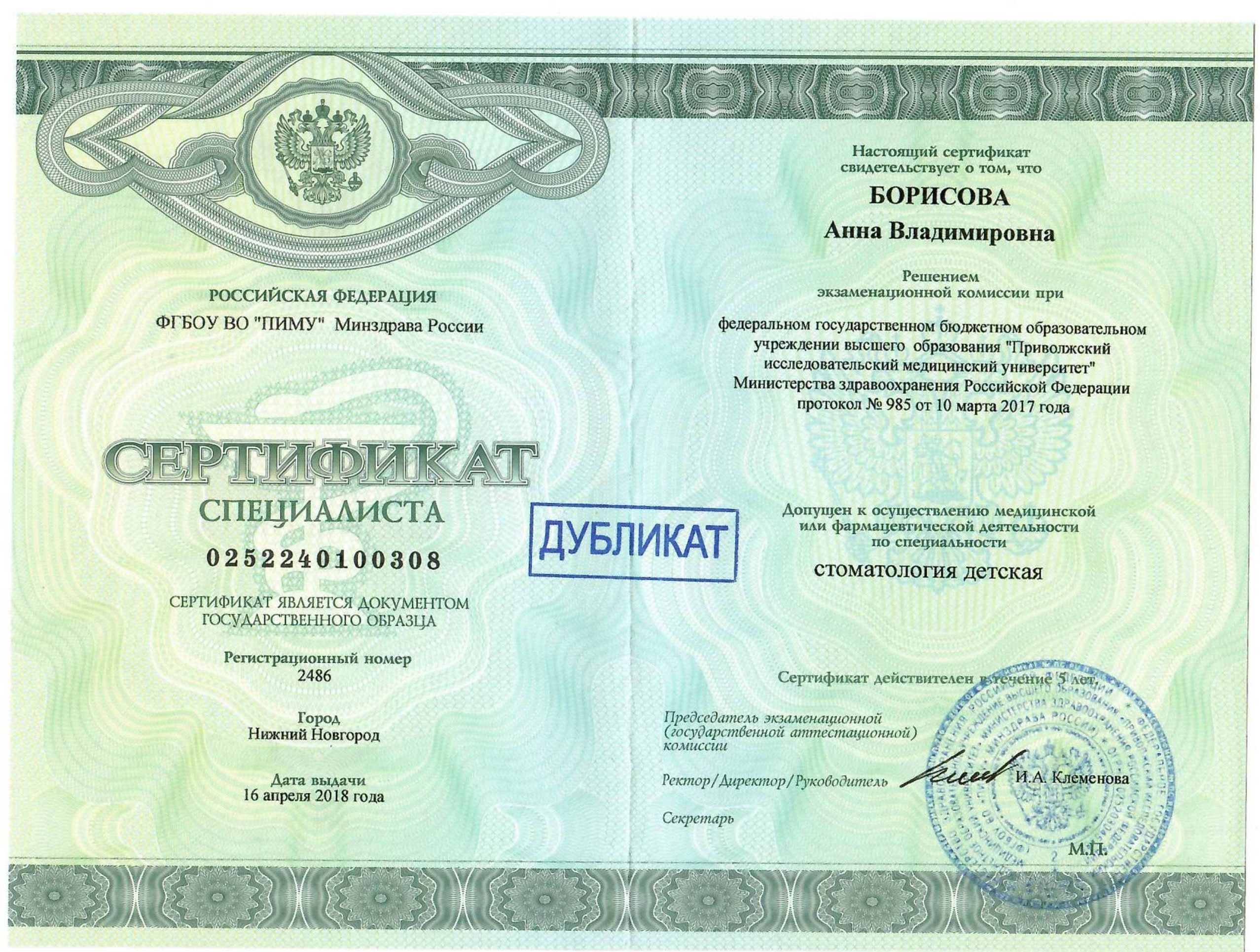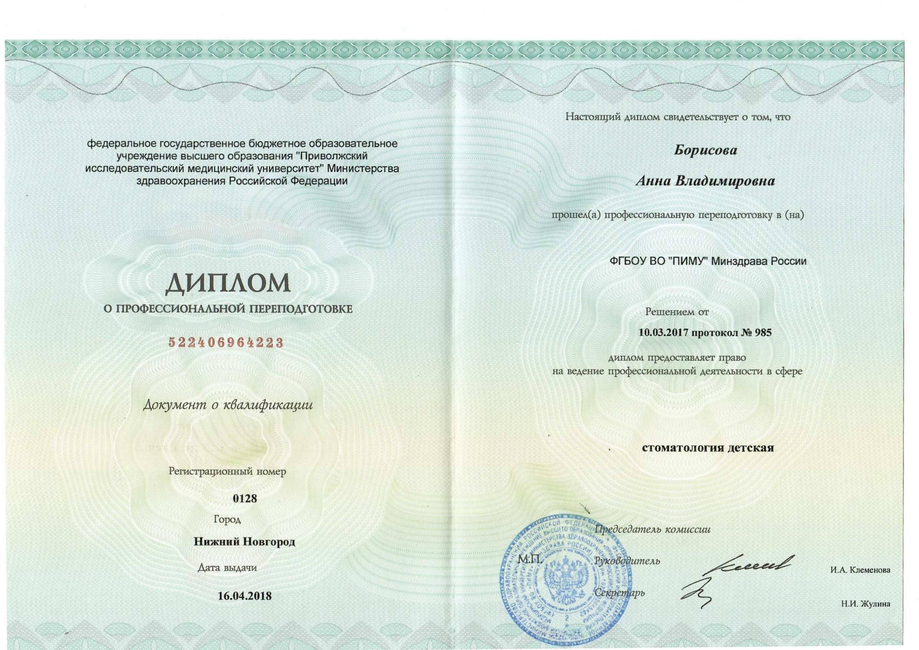 - Диплом о профессиональной переподготовке, ФГБОУ ВО «ПИМУ» Минздрава России, год выдачи — 2018, по программе «Стоматология детская».