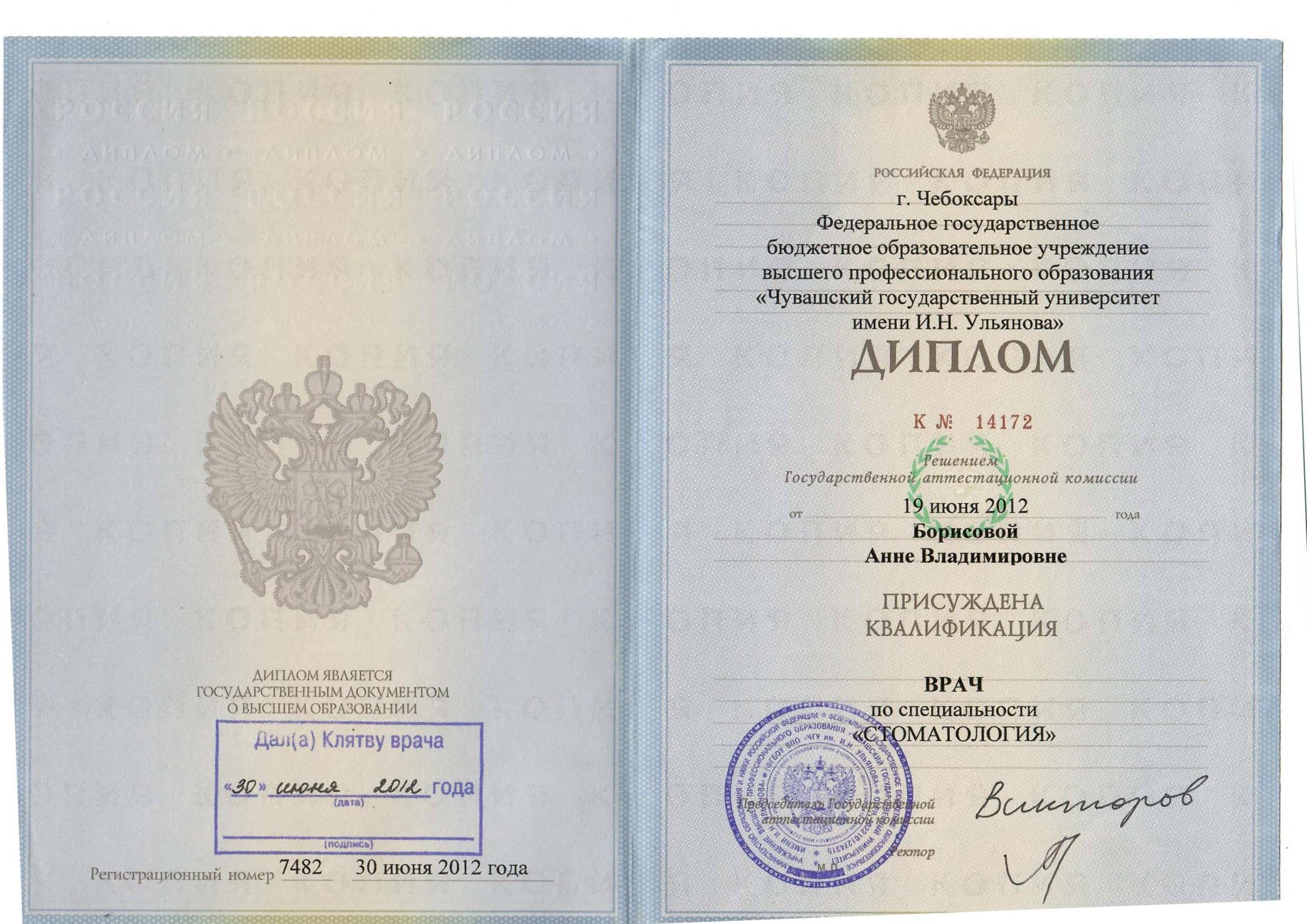 - Диплом о высшем образовании, Федеральное государственное бюджетное образовательное учреждение высшего профессионального образования «Чувашский государственный университет имени И.Н. Ульянова», год выдачи — 2012, квалификация «Врач» по специальности «Стоматология»;