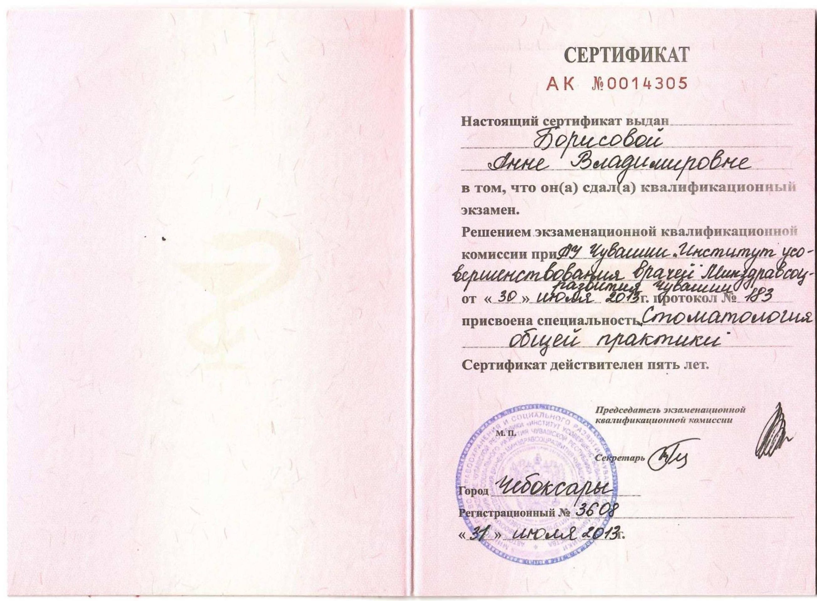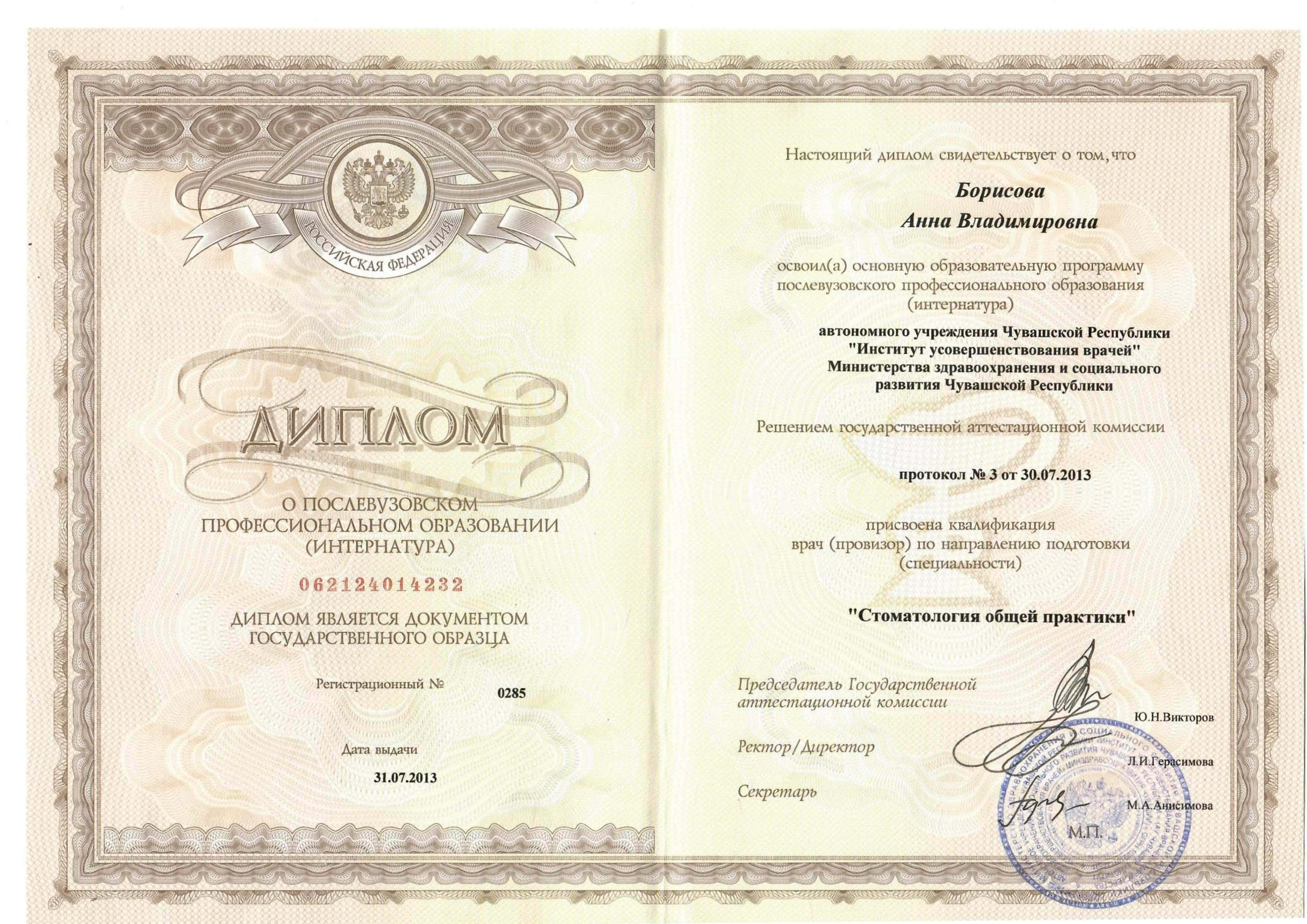 - Диплом о послевузовском профессиональном образовании (интернатура), автономное учреждение Чувашской Республики «Институт усовершенствования врачей», год выдачи — 2013, квалификация «Врач» по специальности «Стоматология общей практики»;