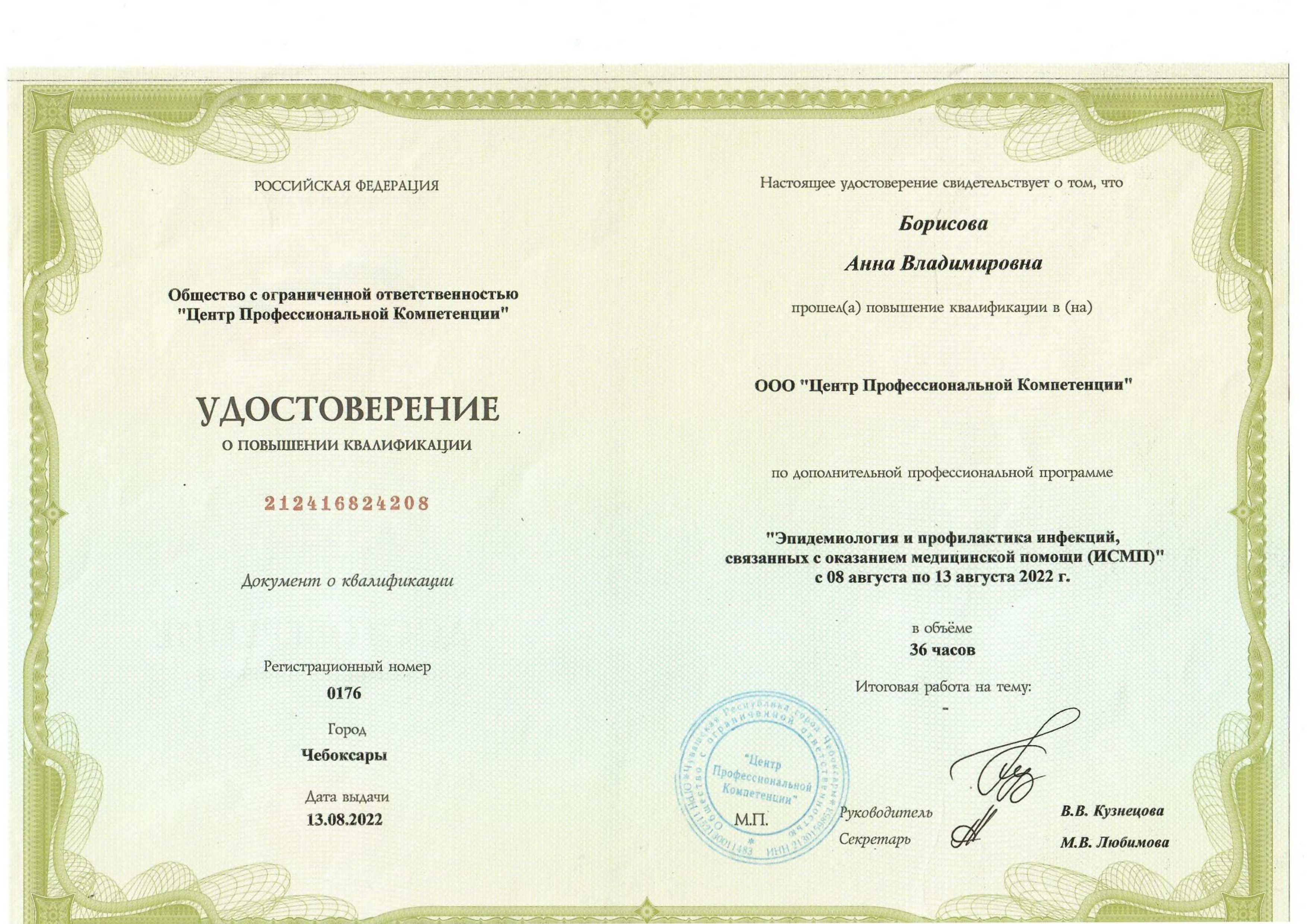 - 2022 г. – в ООО «Центр Профессиональной Компетенции», по программе «Эпидемиология и профилактика инфекций, связанных с оказанием медицинской помощи (ИСМП)».