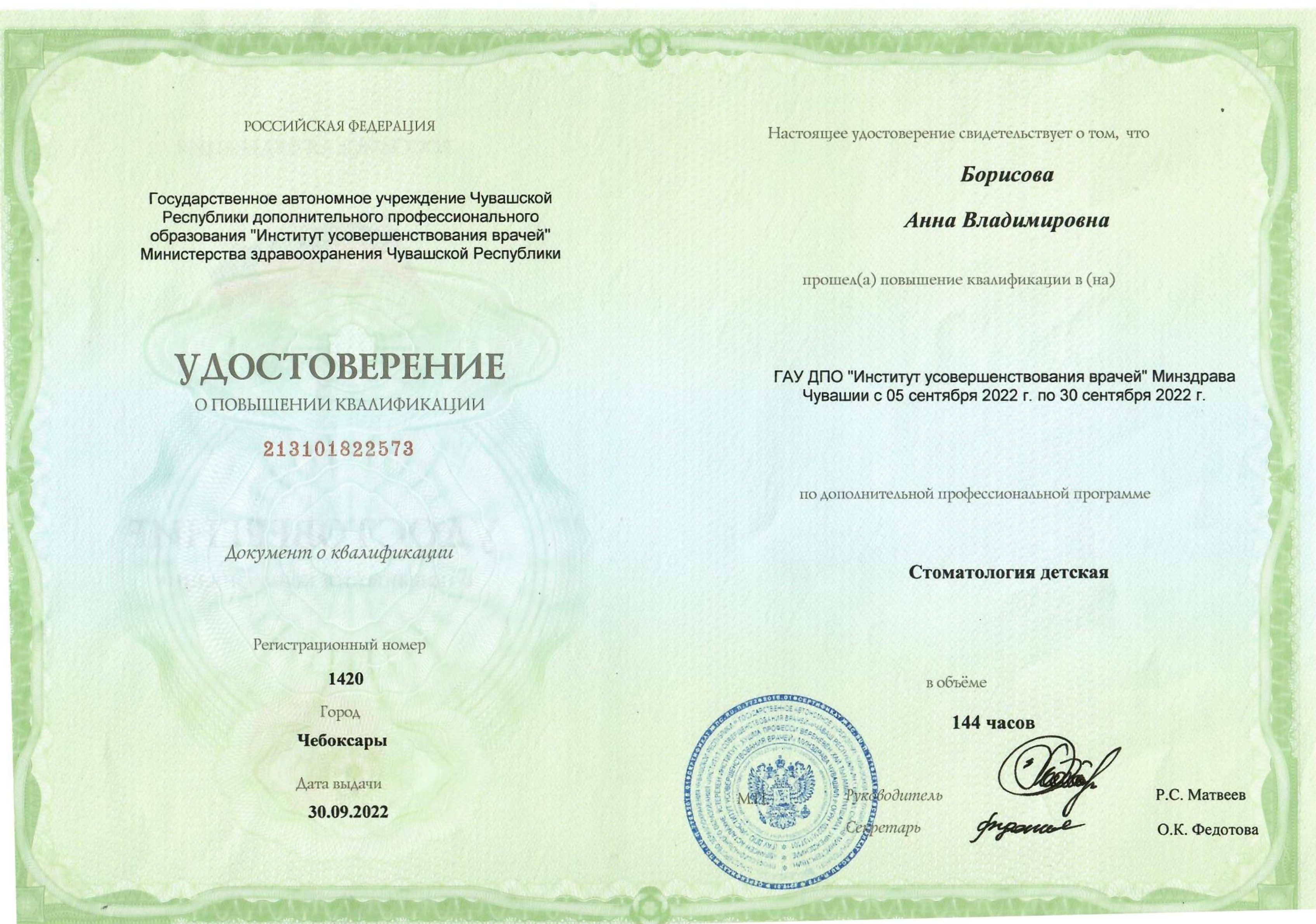 - 2022 г. – в ГАУ ДПО «Институт усовершенствования врачей», по программе «Стоматология детская»;