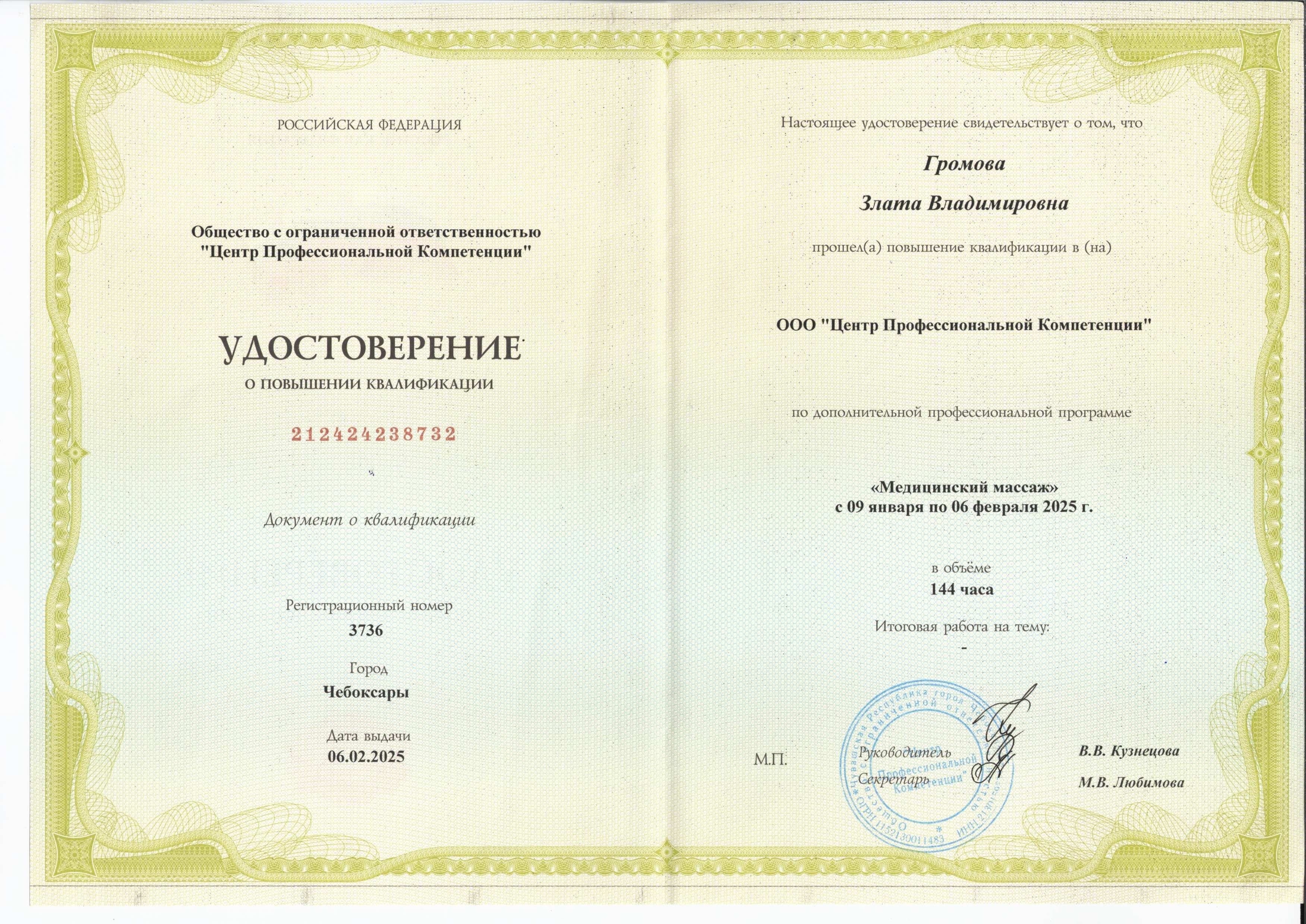 - Диплом о профессиональной переподготовке, ООО «Центр Профессиональной Компетенции», год выдачи 2020, по специальности «Медицинский массаж».