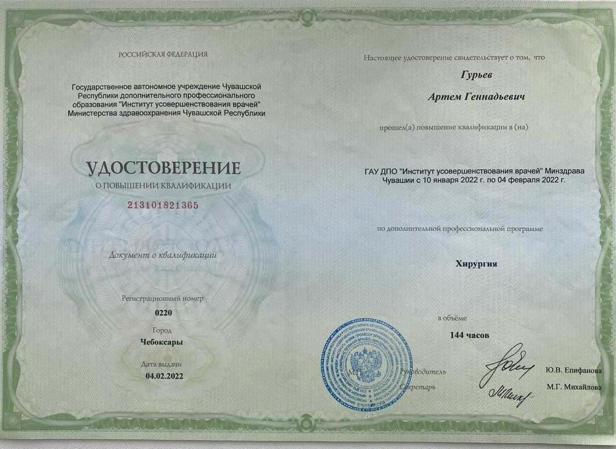 • 2022г. — ГАУ ЧР ДПО «Институт усовершенствования врачей» по программе «Хирургия».