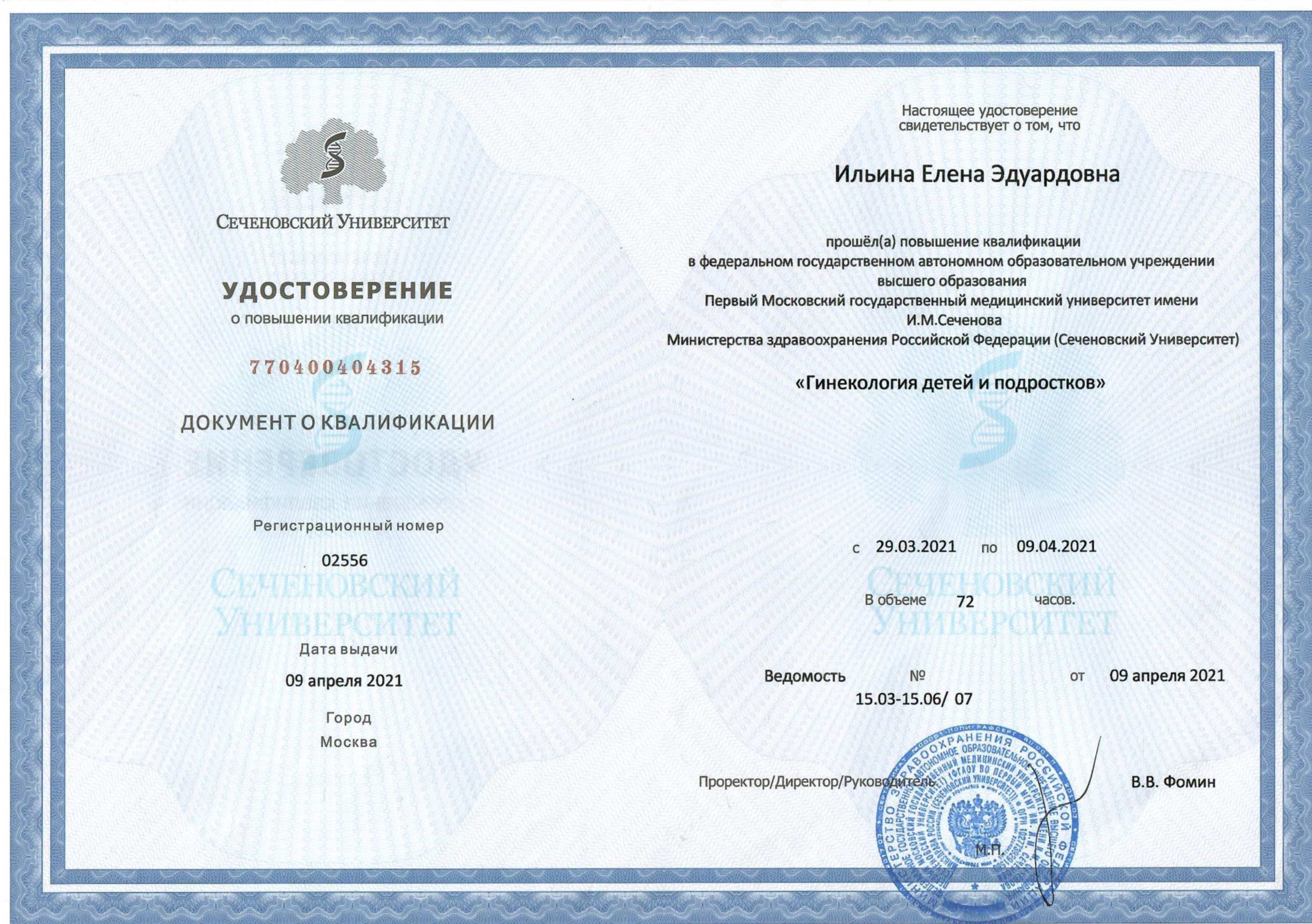 - 2021г.- ФГАОУ ВО Первый МГМУ им. И.М. Сеченова Минздрава России по программе «Гинекология детей и подростков»;