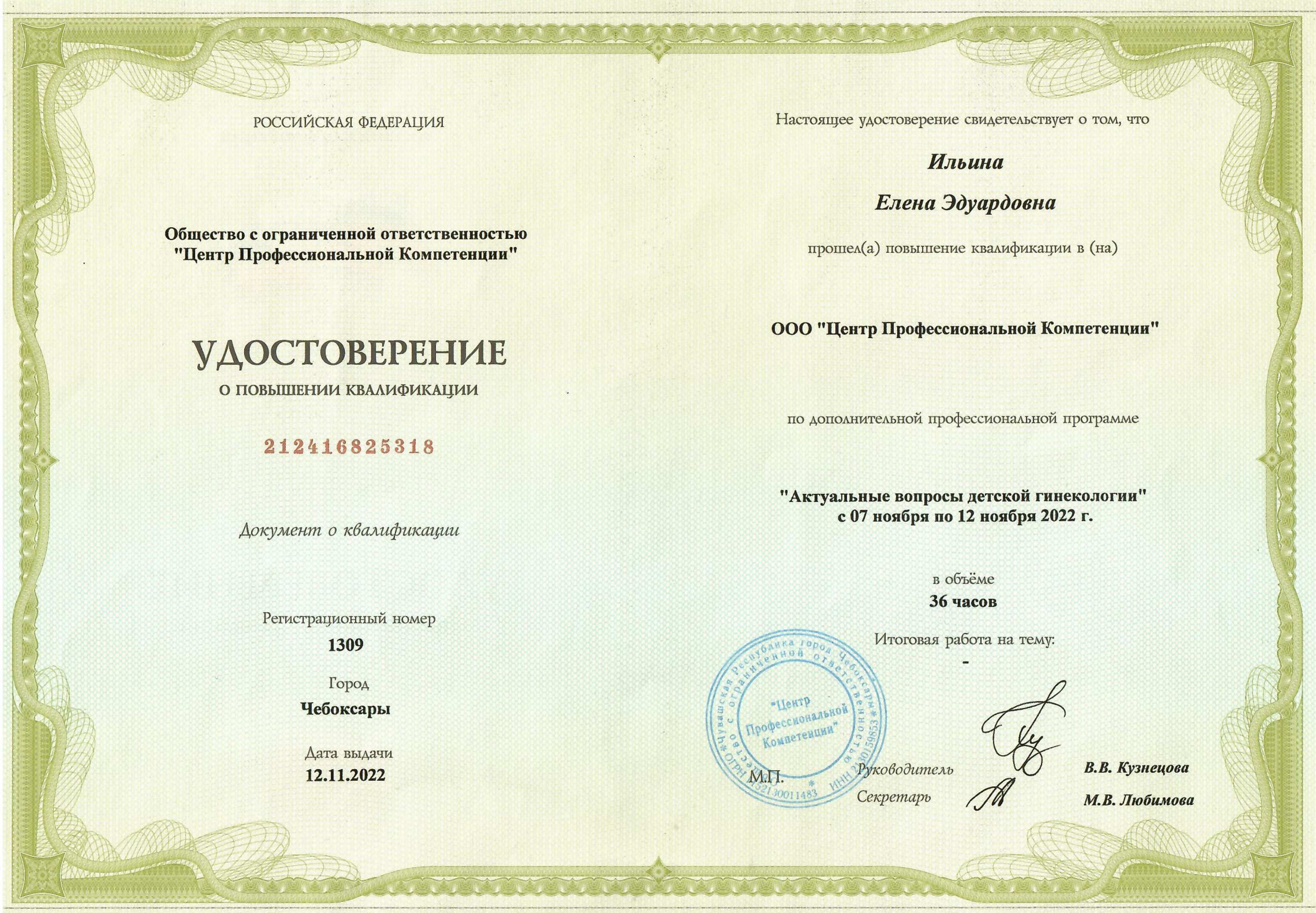 - 2022г. — ООО Центр Профессиональной Компетенции по программе «Актуальные вопросы детской гинекологии».