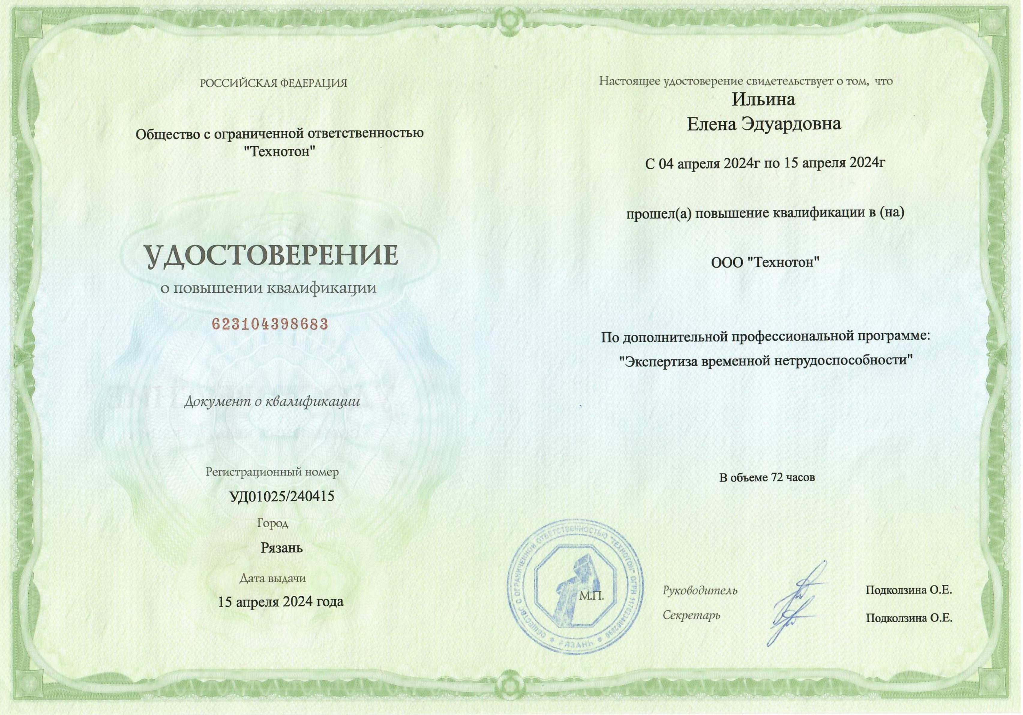 - Диплом о профессиональной переподготовке, «ФГБОУ ВО Приволжский исследовательский медицинский университет», год выдачи — 2024, по программе «Ультразвуковая диагностика».