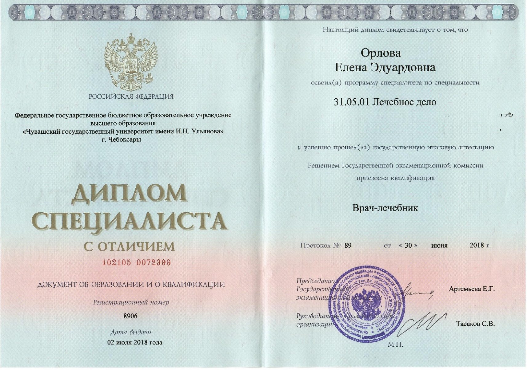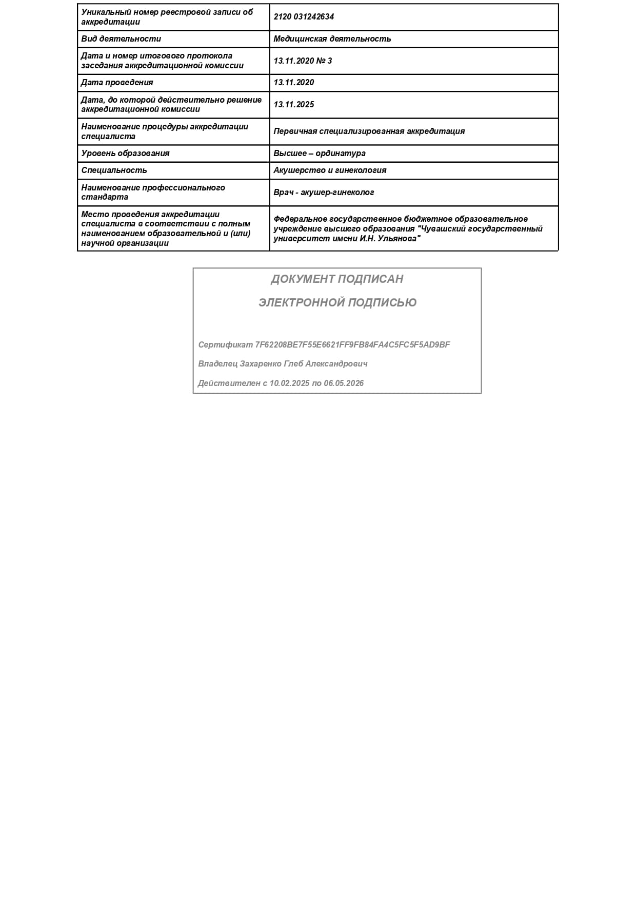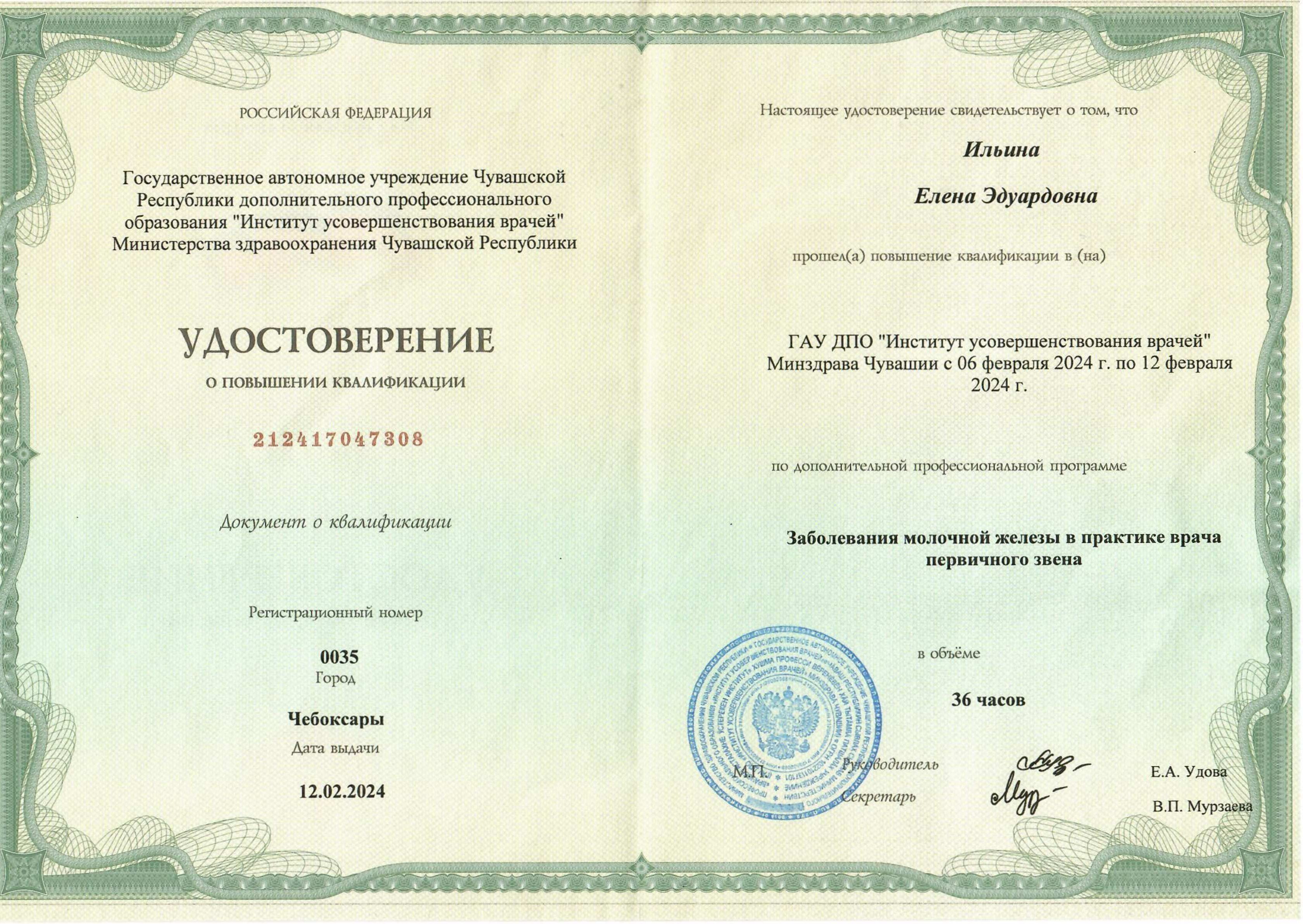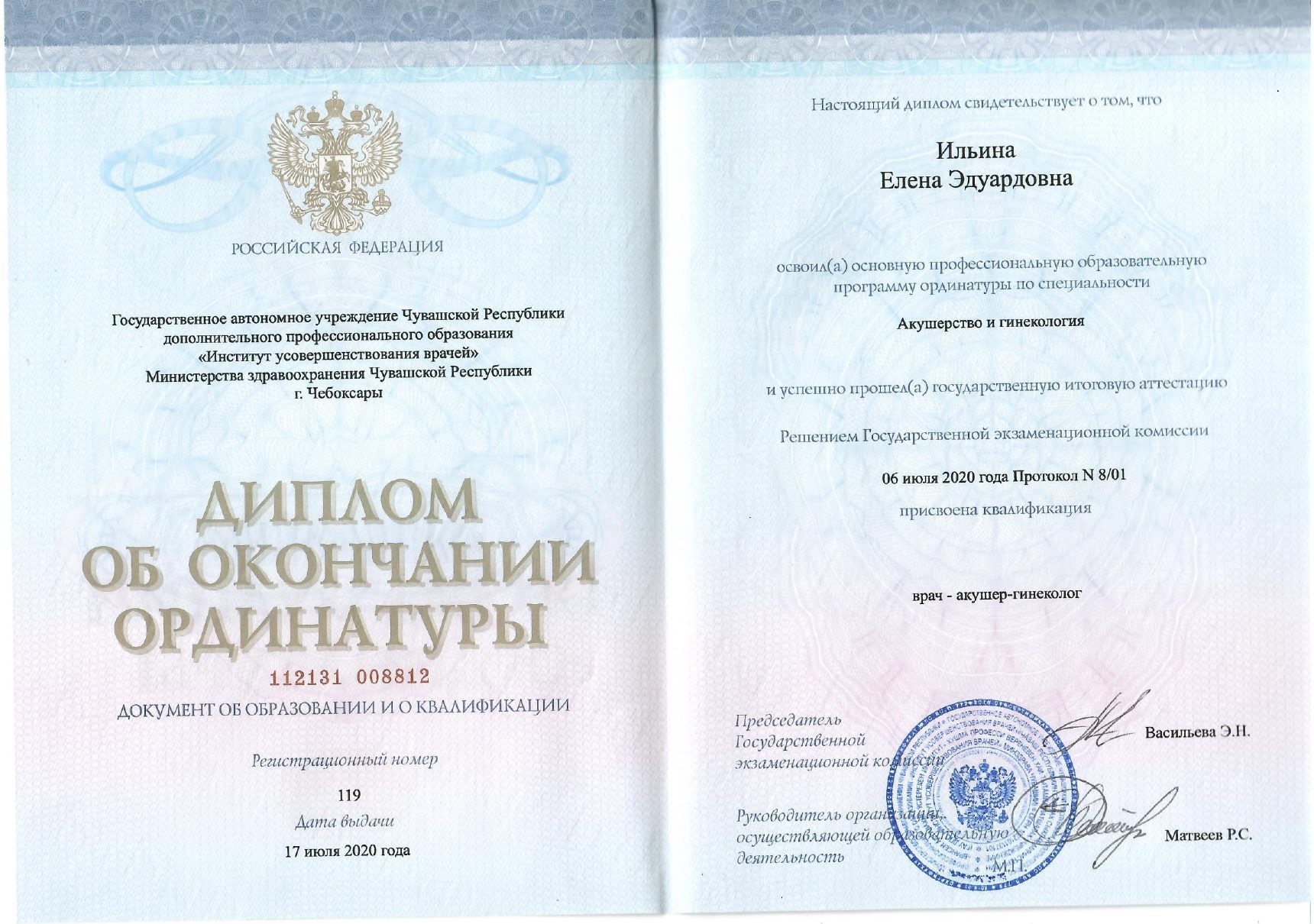 - Диплом об окончании ординатуры, ГАУ ЧР ДПО «Институт усовершенствования врачей», год выдачи — 2020, квалификация «Врач-акушер-гинеколог» по специальности «Акушерство и гинекология»;