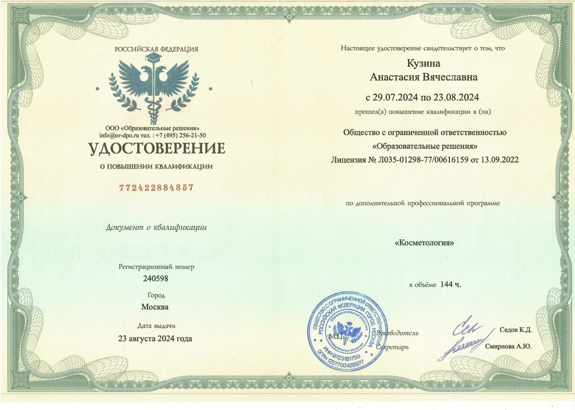 - 2024г. — ООО «Образовательные решения» по программе «Косметология».