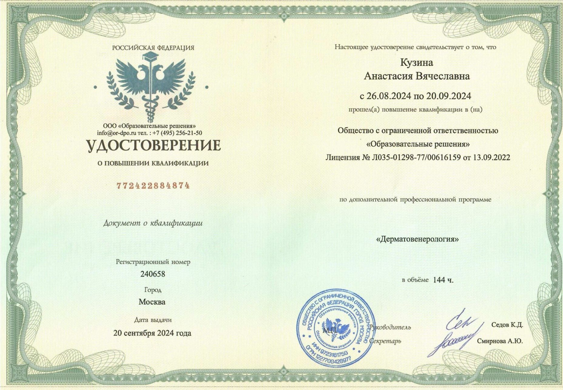 - 2024г. — ООО «Образовательные решения» по программе «Дерматовенерология»;