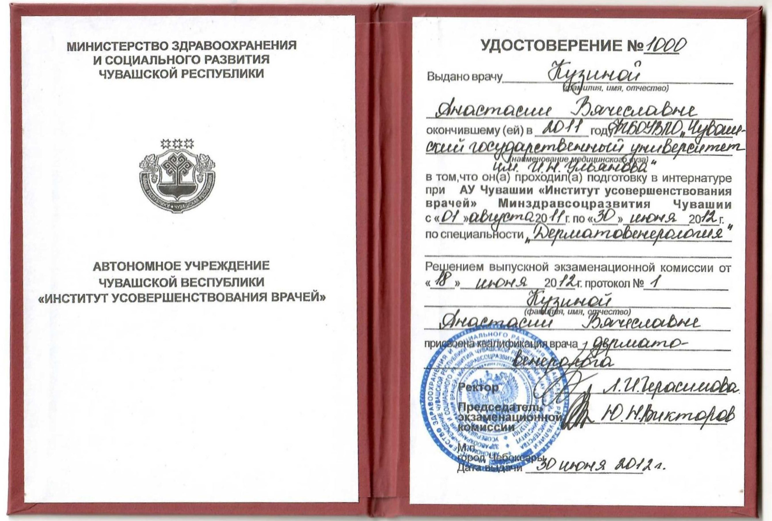 - Удостоверение о прохождении интернатуры, ФГБОУВПО «Чувашский государственный университет имени И.Н. Ульянова», год выдачи — 2012, квалификация «Врач-дерматовенеролог» по специальности «Дерматовенерология»;