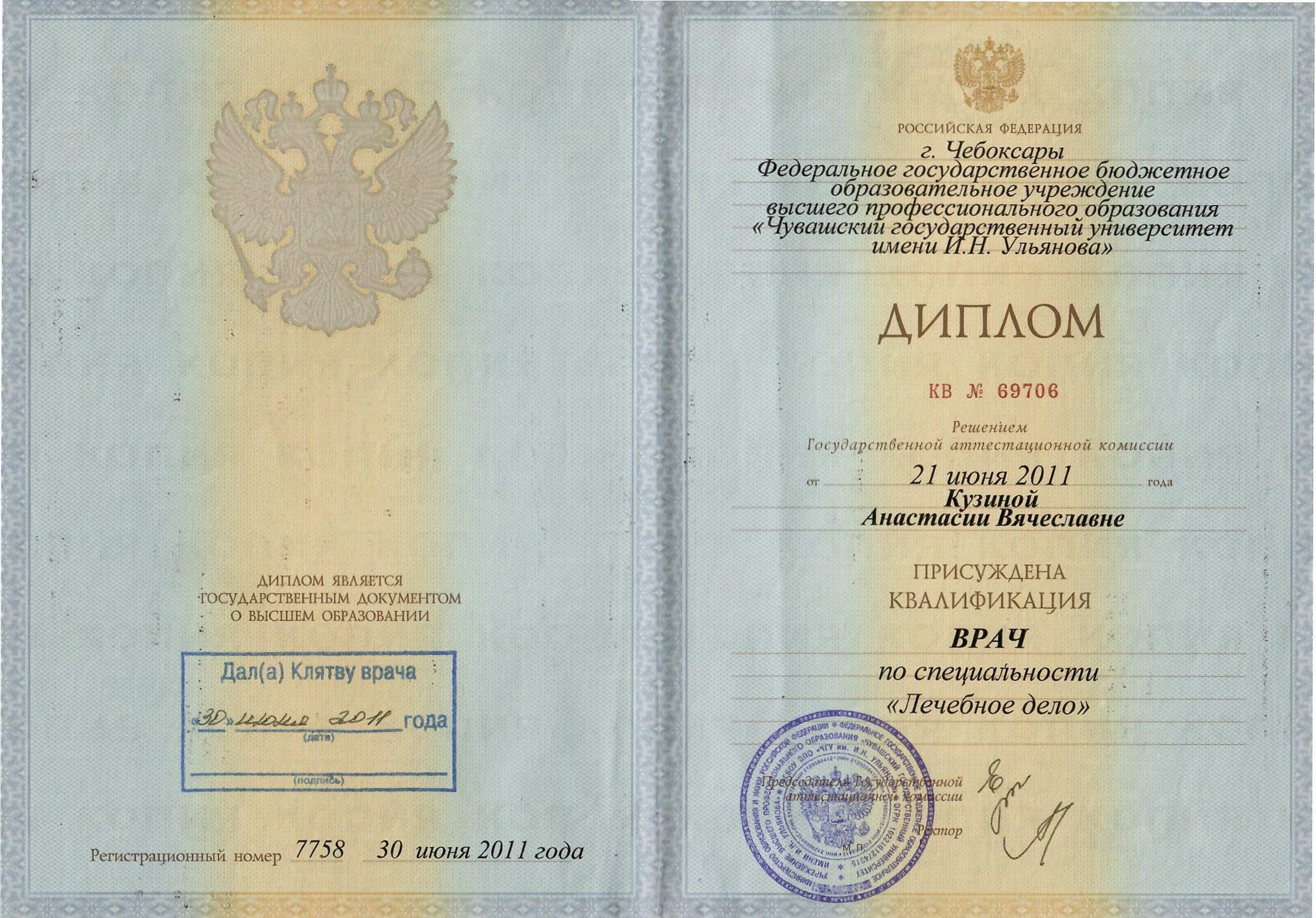 - Диплом о высшем образовании, ФГБОУВПО «Чувашский государственный университет имени И.Н. Ульянова», год выдачи — 2011, квалификация «Врач» по специальности «Лечебное дело»;