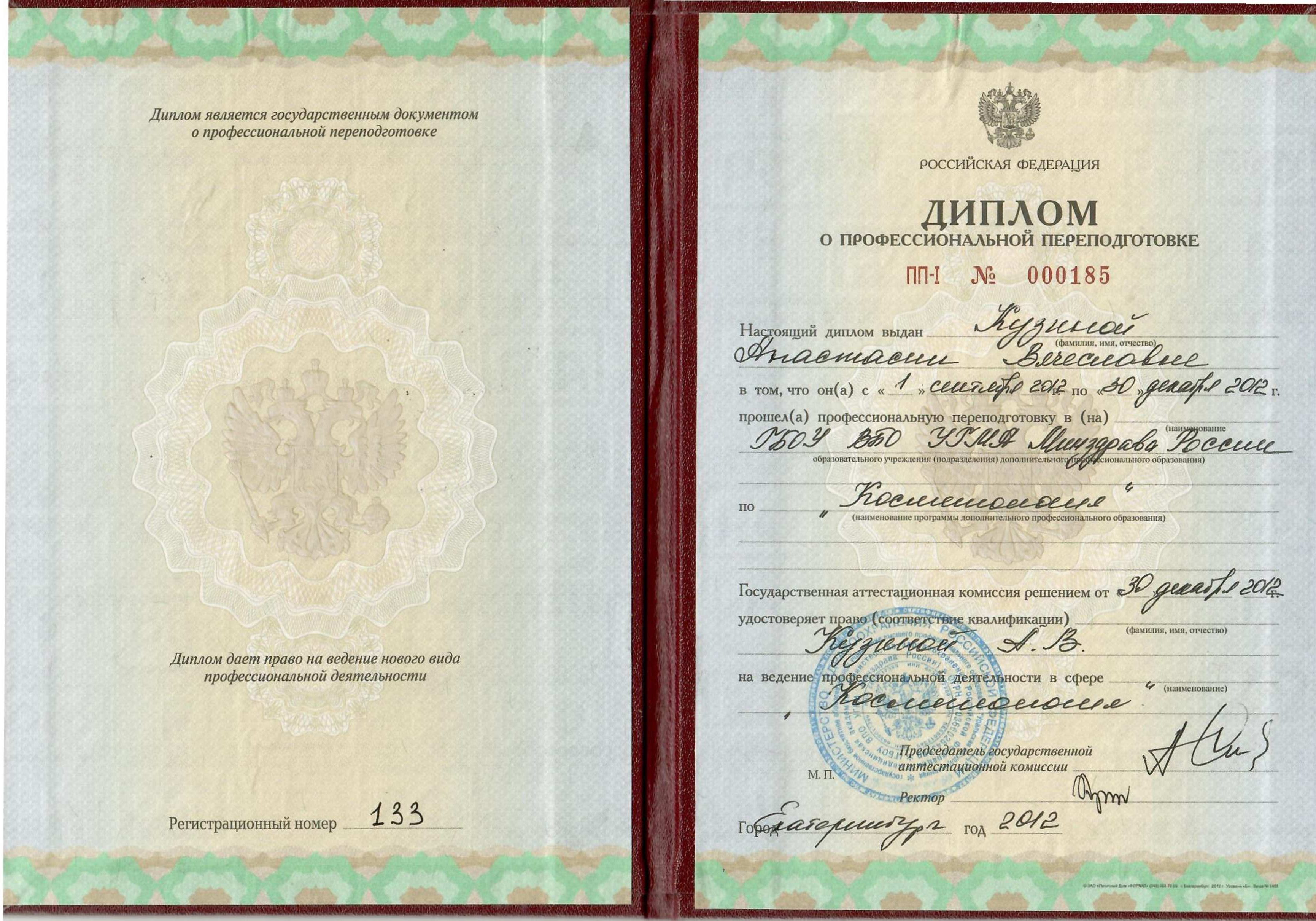 - Диплом о профессиональной переподготовке, ГБОУ ВБО «Уральский государственный медицинский университет», год выдачи — 2012, по специальности «Косметология».
