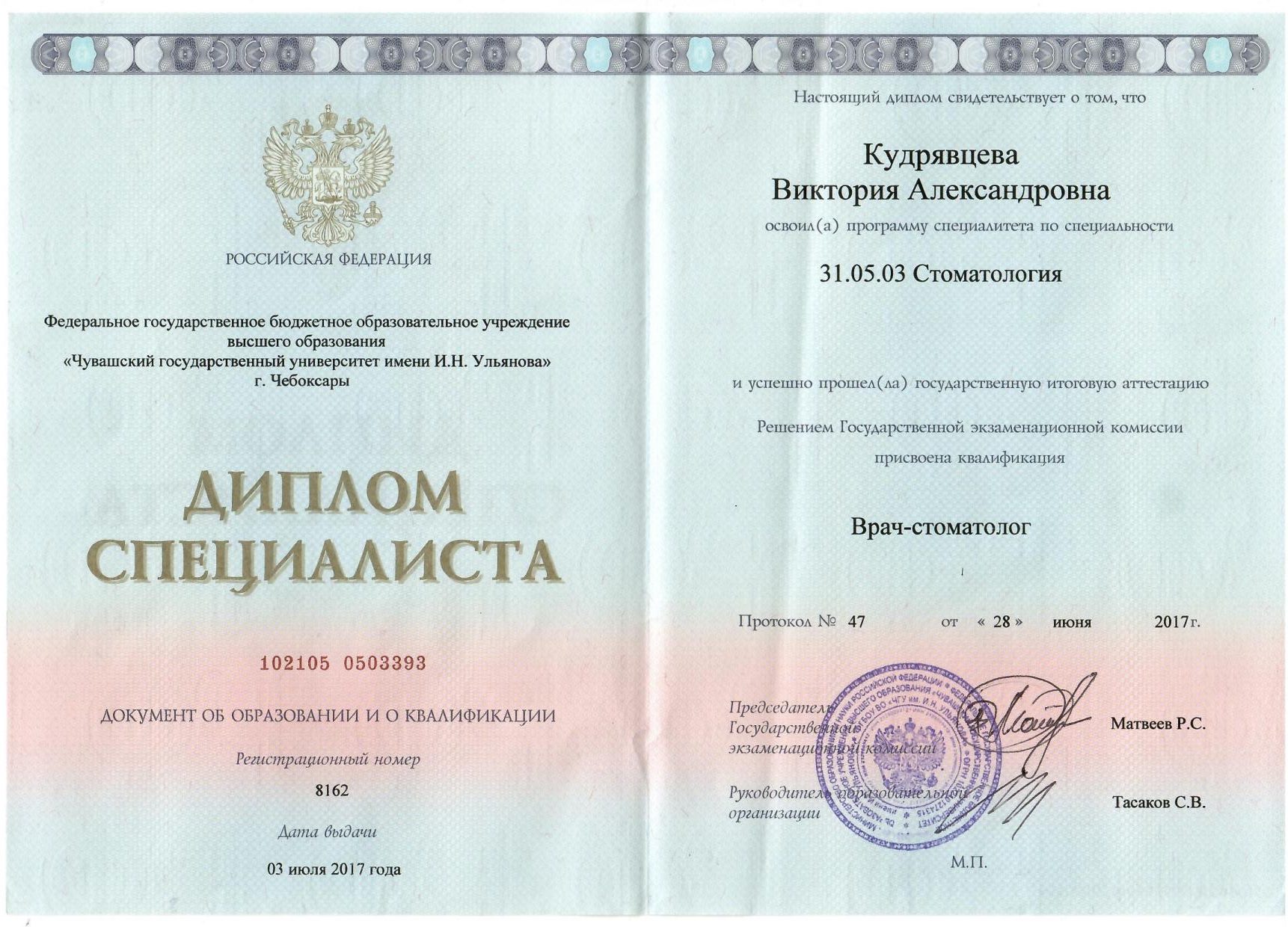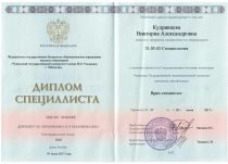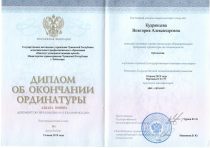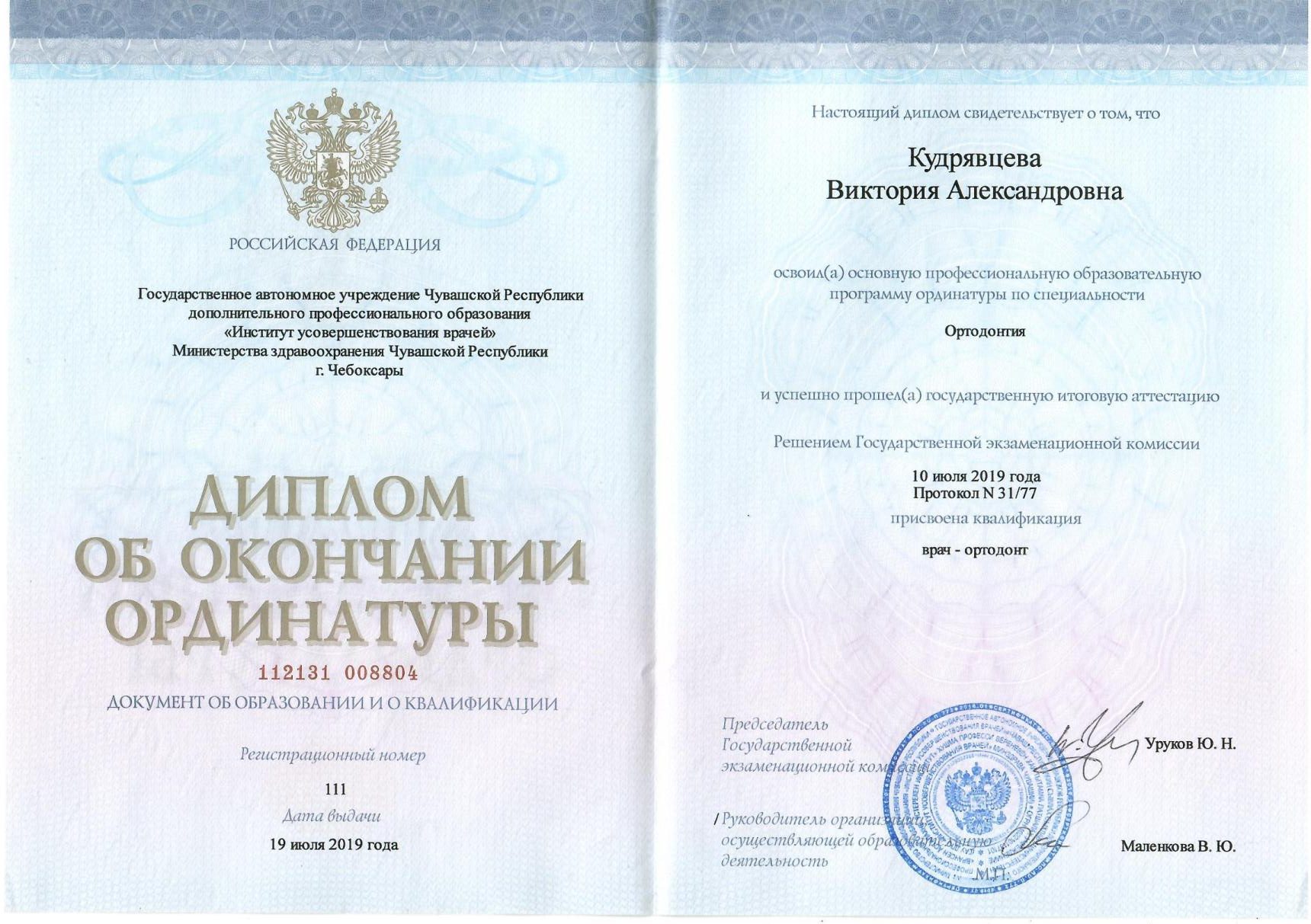 - Диплом об окончании ординатуры, ГАУ ЧР ДПО «Институт усовершенствования врачей», год выдачи — 2019, квалификация «Врач-ортодонт» по специальности «Ортодонтия».