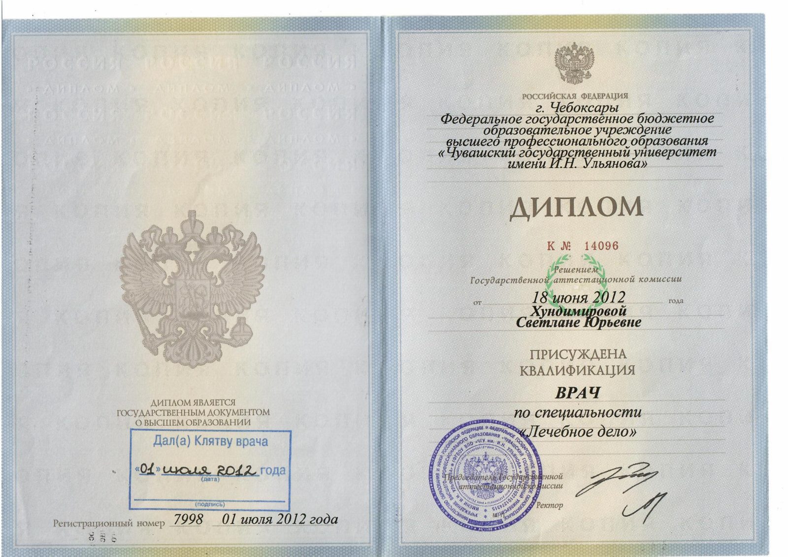 - Диплом о высшем образовании, Федеральное государственное бюджетное образовательное учреждение высшего профессионального образования «Чувашский государственный университет имени И.Н. Ульянова», год выдачи — 2012, квалификация «Врач» по специальности «Лечебное дело»;