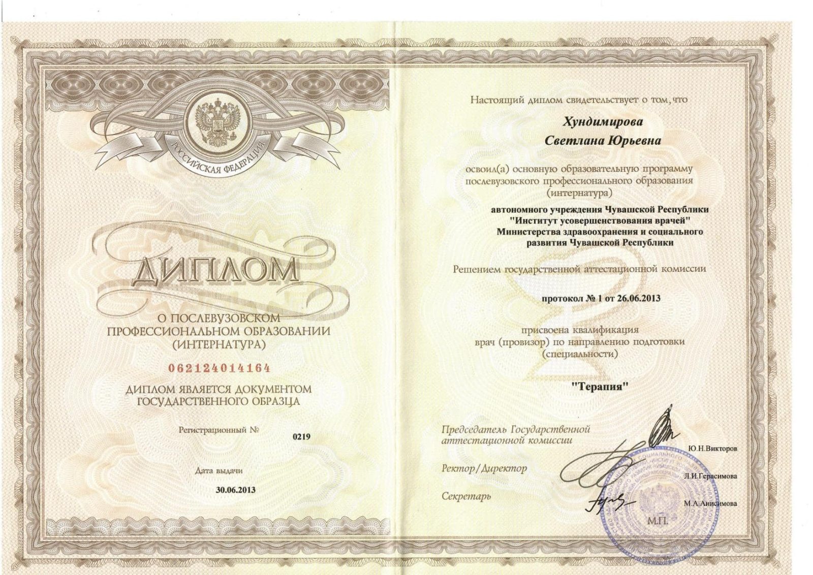 - Удостоверение о прохождении интернатуры, АУ ЧР «Институт усовершенствования врачей» МЗиСР ЧР, год выдачи — 2013, квалификация «Врач» по специальности «Терапия»;