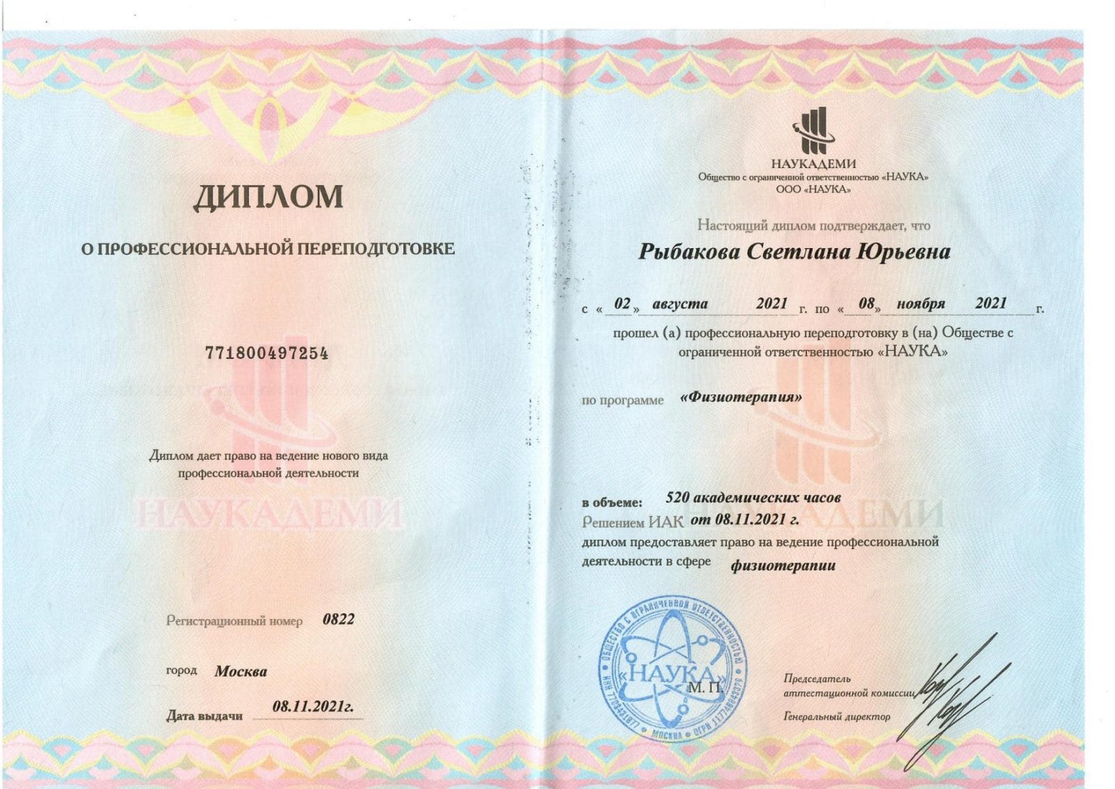 - Диплом о профессиональной переподготовке, ООО «НАУКА», год выдачи — 2021, по специальности «Физиотерапия».