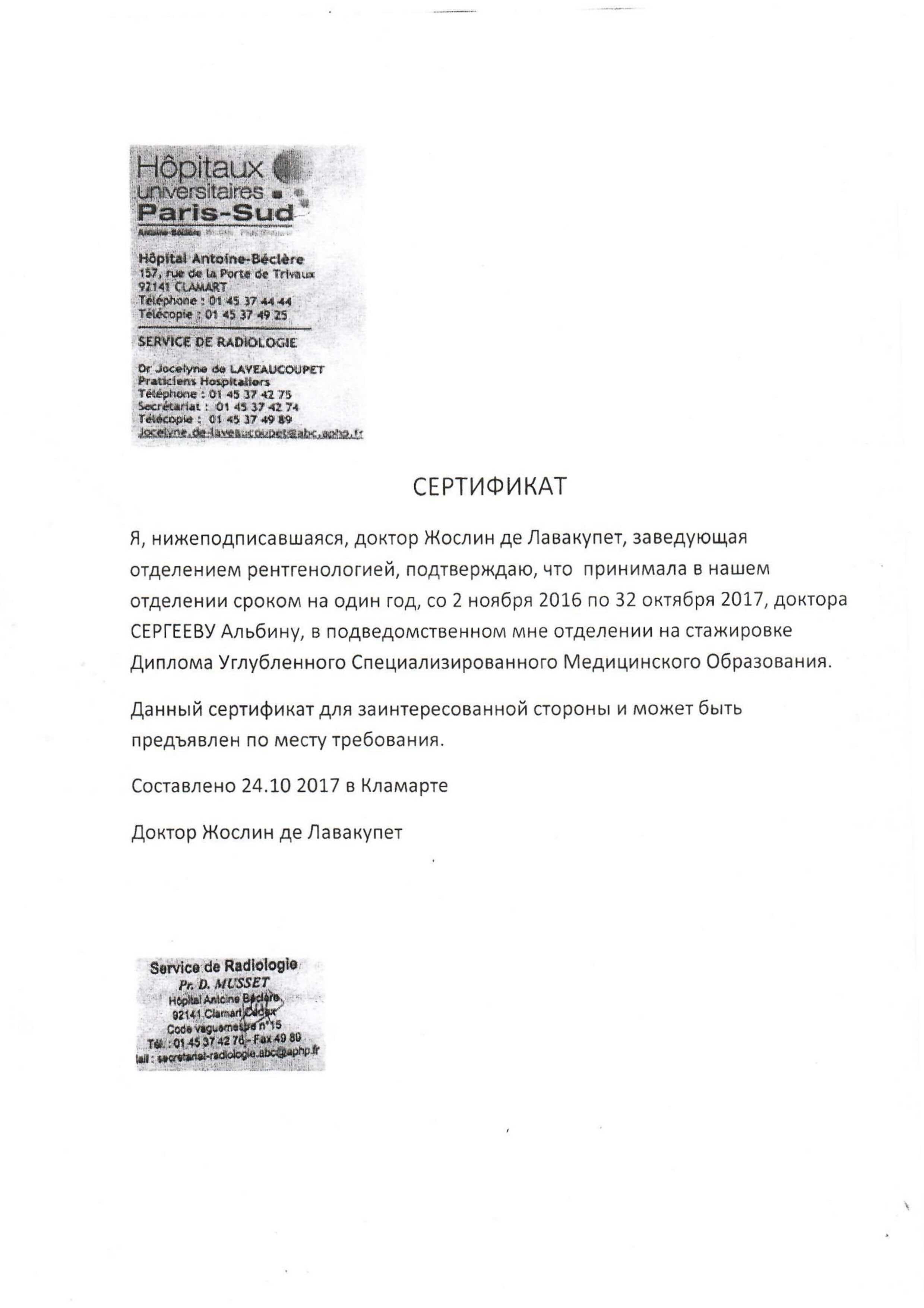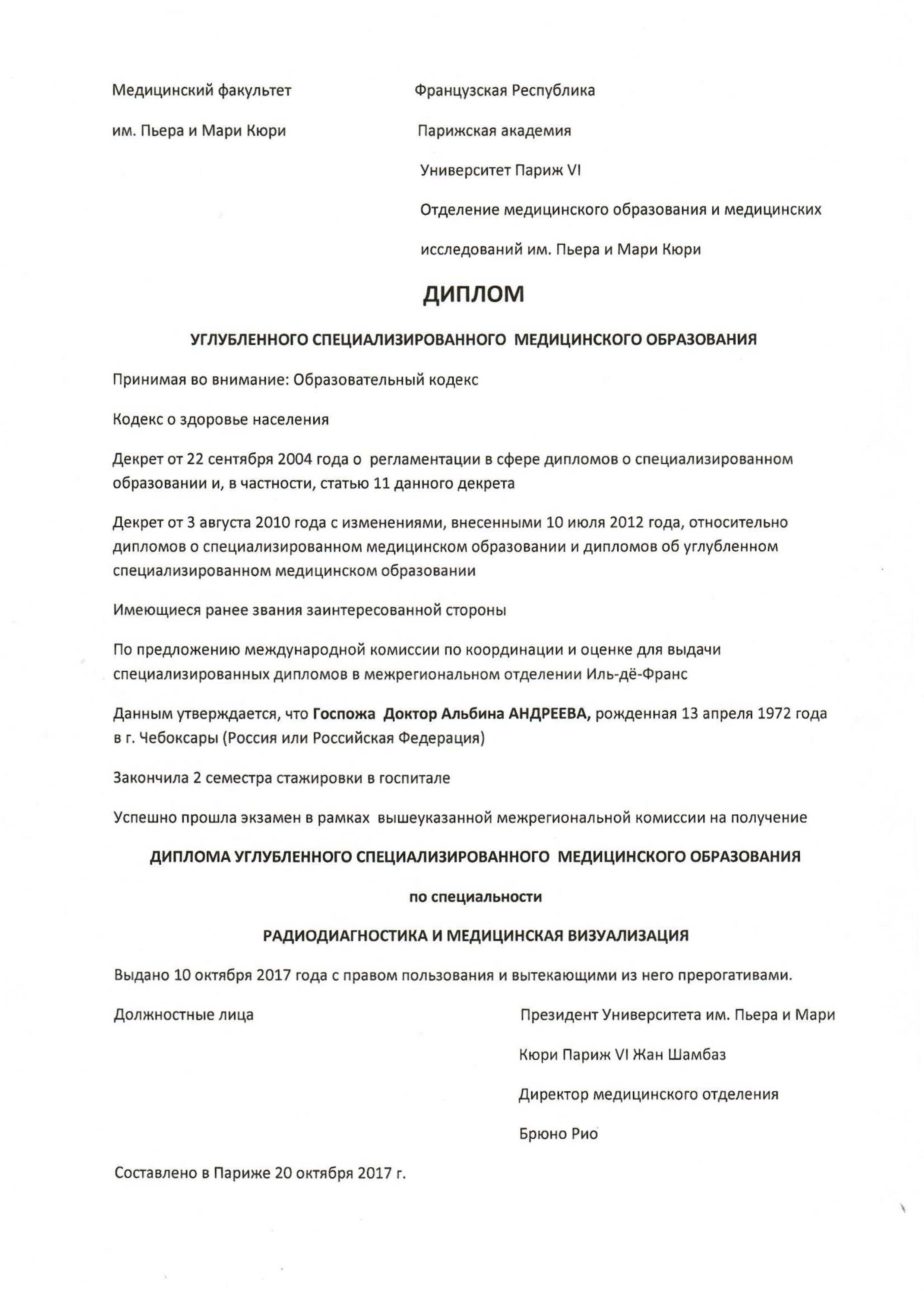 - Диплом о послевузовском профессиональном образовании (интернатура), АУ ЧР «Институт усовершенствования врачей» МЗиСР ЧР, год выдачи — 2014, по специальности «Рентгенология»;