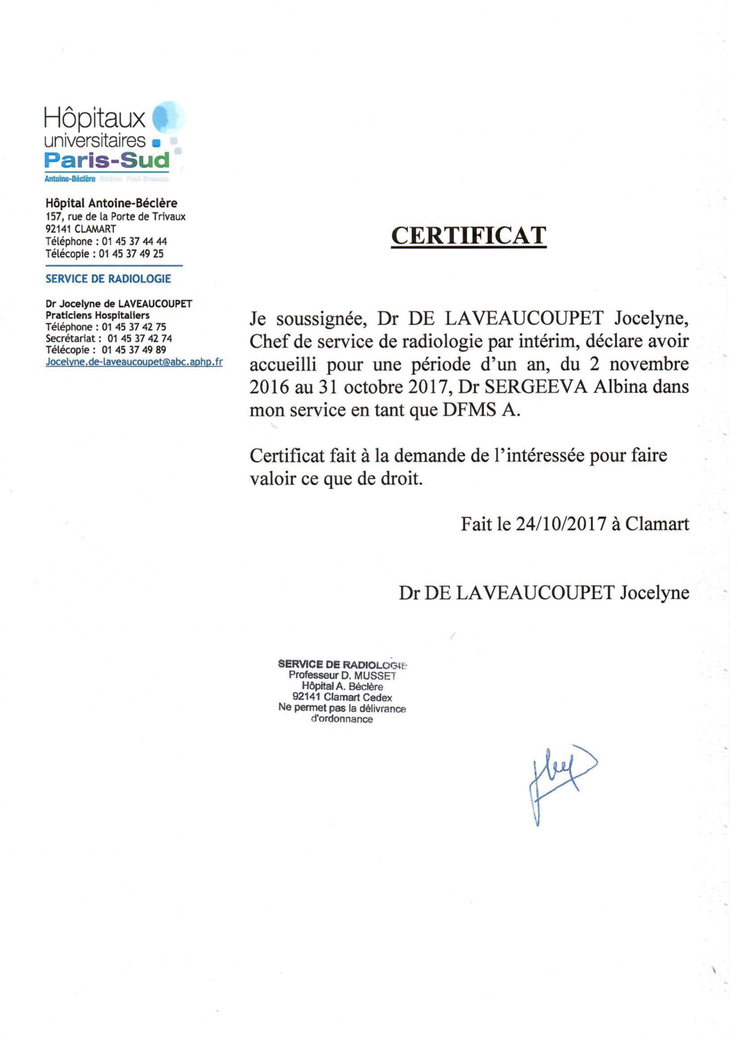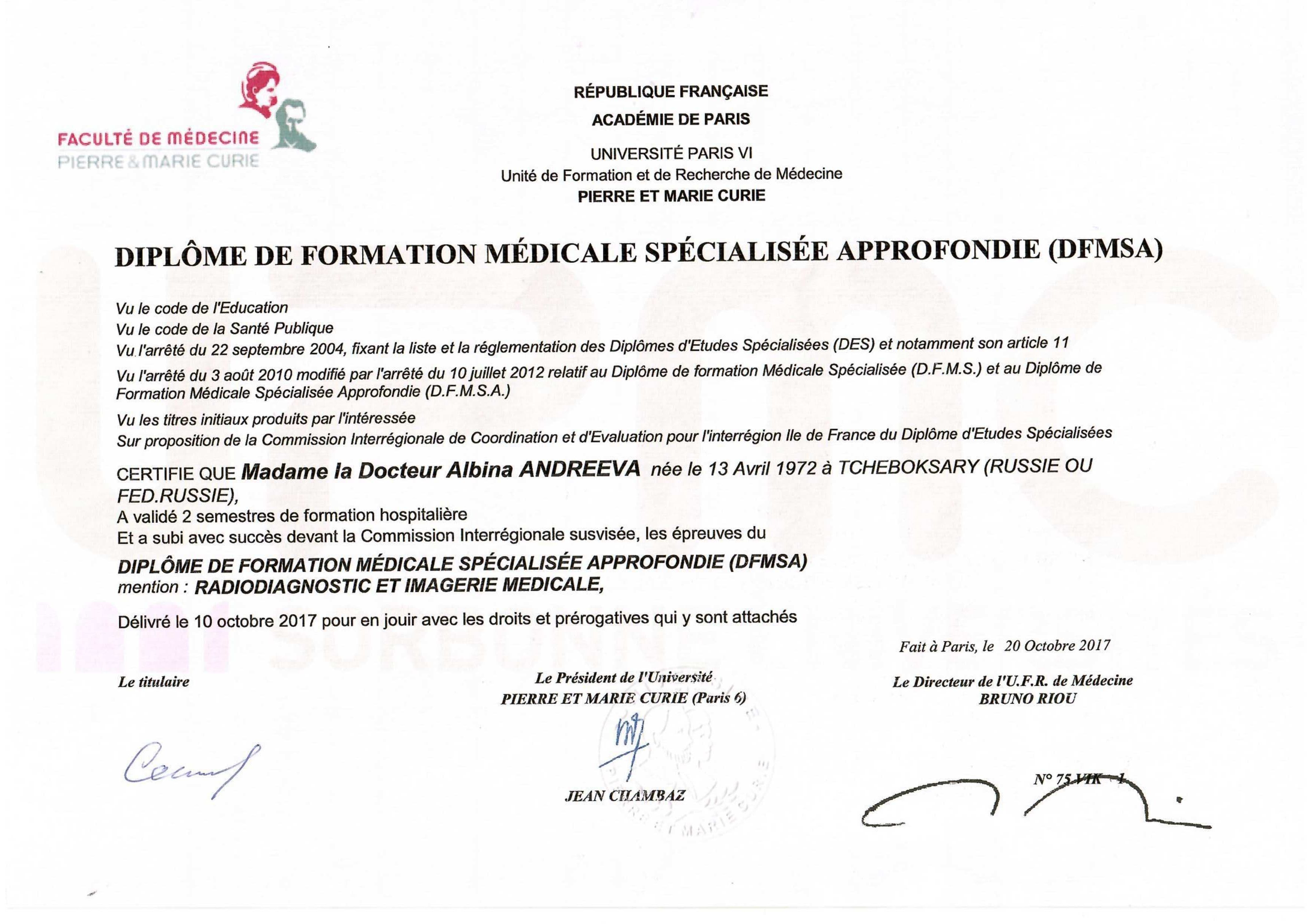 Проходила обучение в Парижской академии Университет им. Пьера Мари Кюри Париж VI Жан Шамбаз по специальности «Радиодиагностика и медицинская визуализация» (диплом углубленного специализированного медицинского образования, дата выдачи — 2017), в период с 02.11.2016 по 31 октября 2017 года закончила 2 семестра стажировки в госпитале.