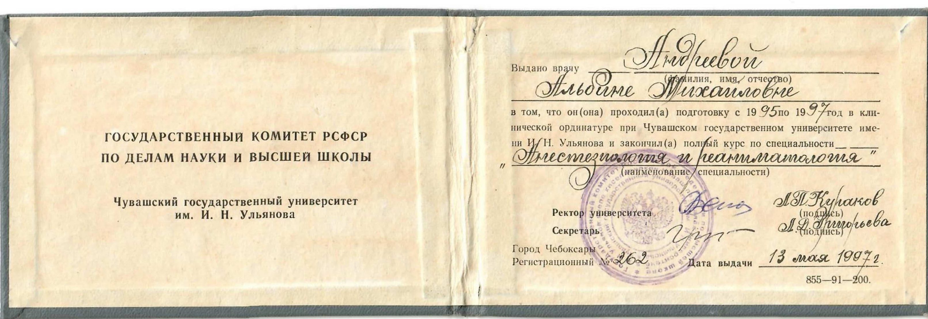 - Удостоверение об окончании ординатуры, ФГБОУВПО «Чувашский государственный университет имени И.Н. Ульянова», год выдачи — 1997, по специальности «Анестезиология и реаниматология»;