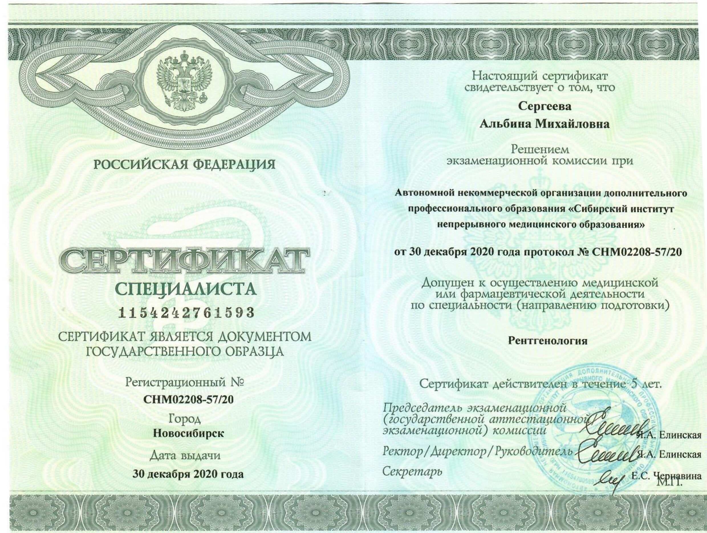 - 2025 г.- АНО ДПО Сибирский институт непрерывного медицинского образования, по программе «Рентгенология».
