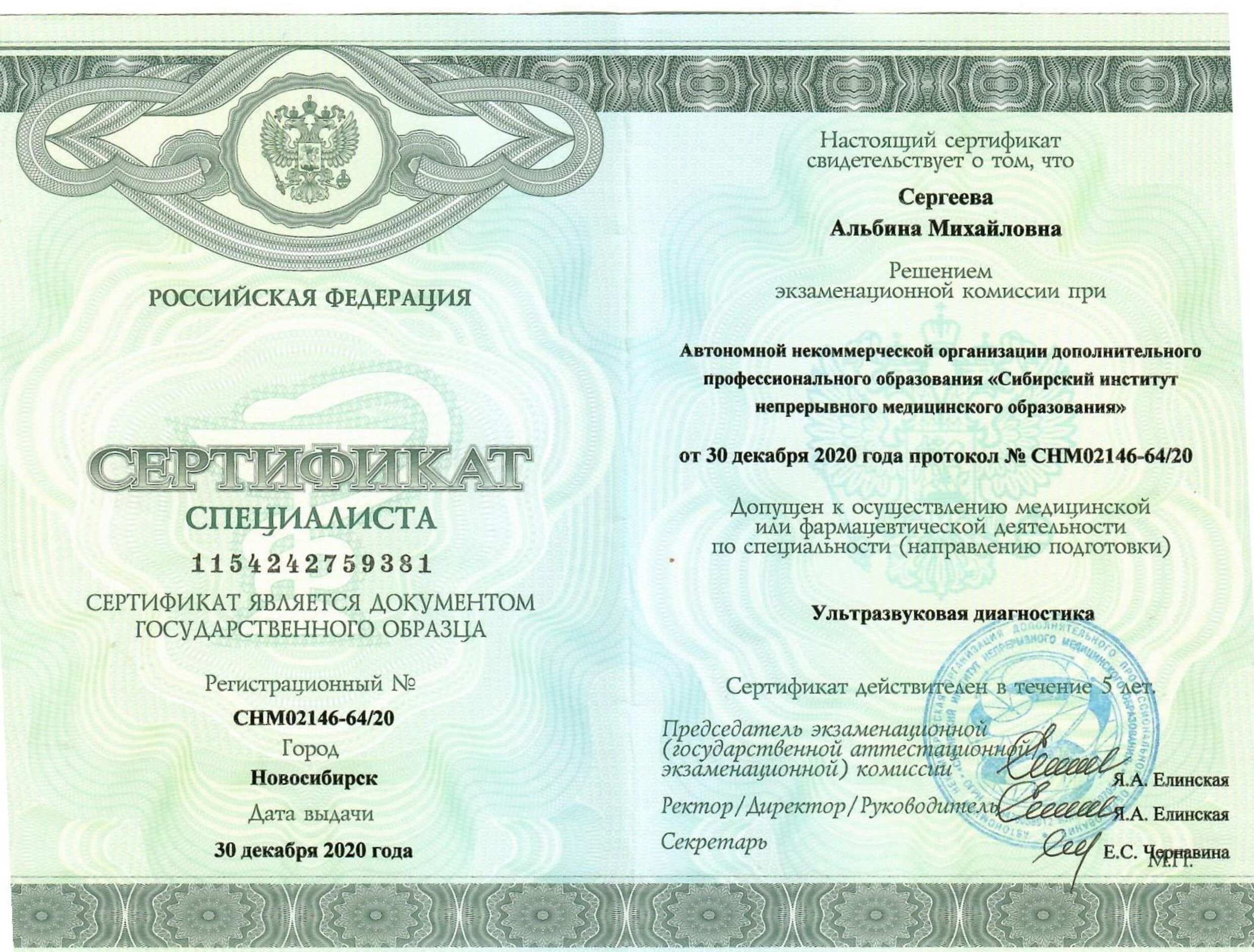 - 2020 г. — АНО ДПО Сибирский институт непрерывного медицинского образования, по программе «Ультразвуковая диагностика»;