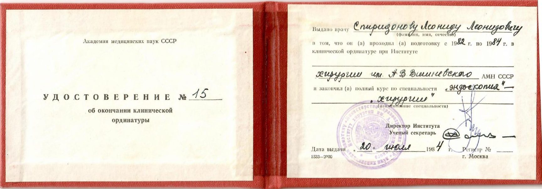 - Удостоверение об окончании ординатуры, ФГБУ НМИЦ Хирургии имени А.В. Вишневского, год выдачи — 1984, квалификация «Врач» по специальности «Эндоскопия- хирургии».
