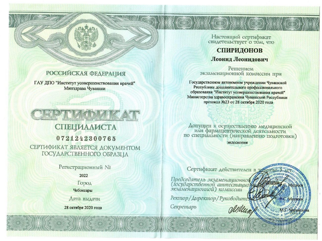 - ФГБОУ ДПО «Российская медицинская академия непрерывного профессионального образования» по специальности «Эндоскопия» срок действия до 29.07.2030г.