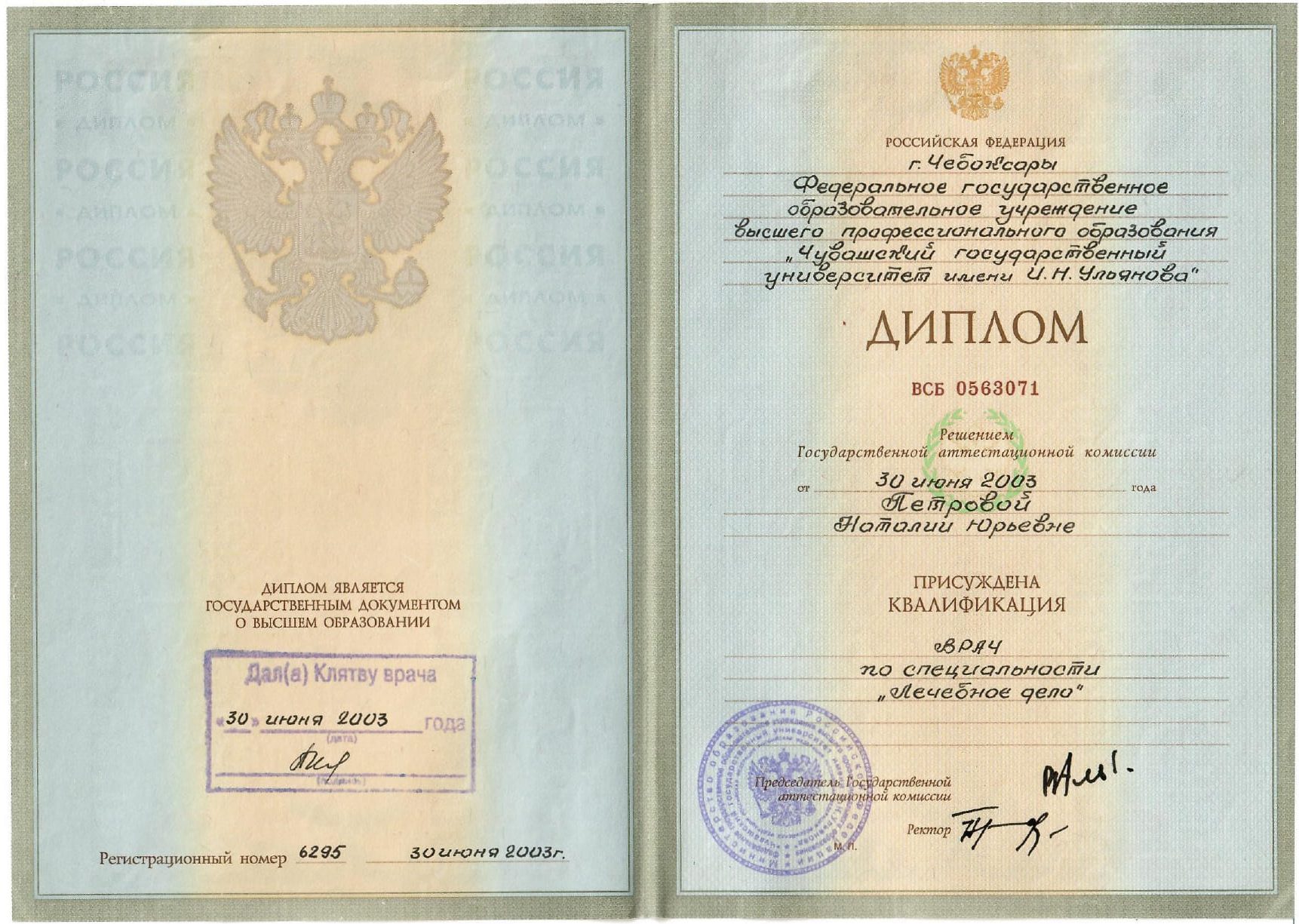 - Диплом об окончании ординатуры, ГОУ «Институт усовершенствования врачей» МЗ ЧР, год выдачи 2004, квалификация «Врач-оториноларинголог» по специальности «Оториноларингология».
