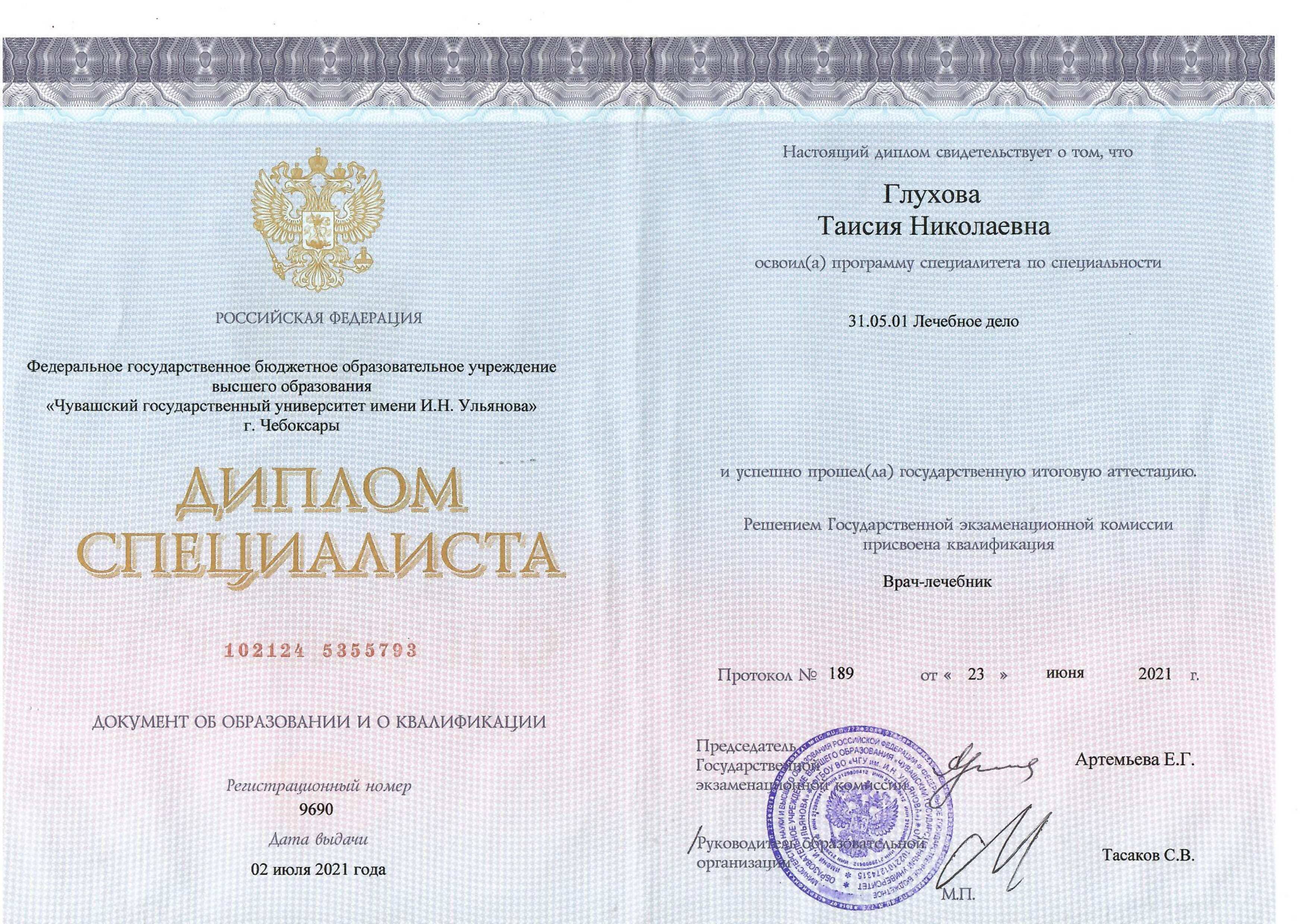 - Диплом о высшем образовании, Федеральное государственное бюджетное образовательное учреждение высшего профессионального образования «Чувашский государственный университет имени И.Н. Ульянова», год выдачи — 2021, квалификация «Врач-лечебник» по специальности «Лечебное дело»;